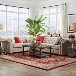 Radcliffe Oatmeal Linen 6-Seater L-Shaped Chesterfield Sectional Sofa with Wood Legs by HomeSullivan