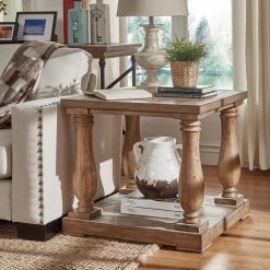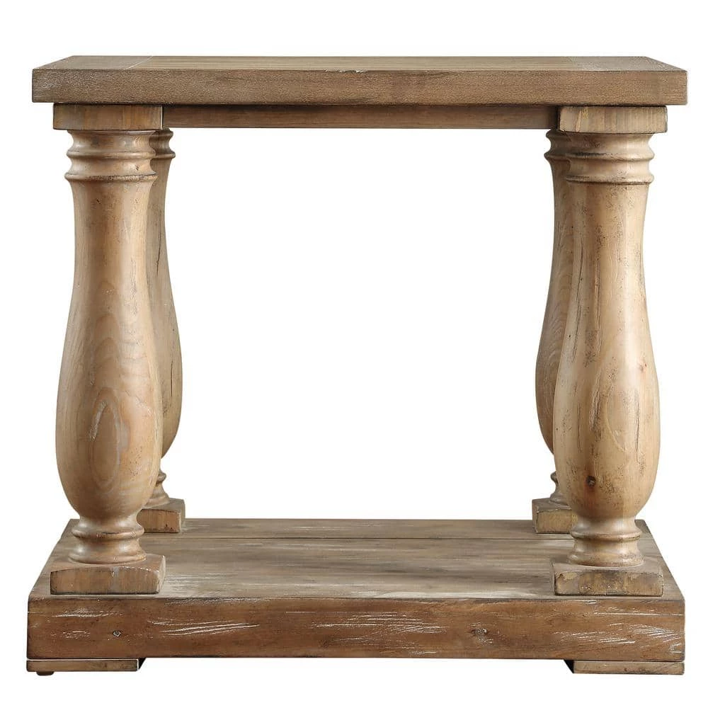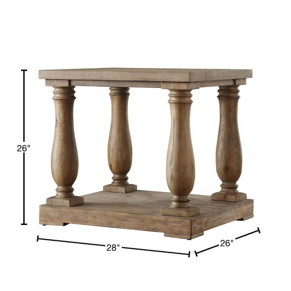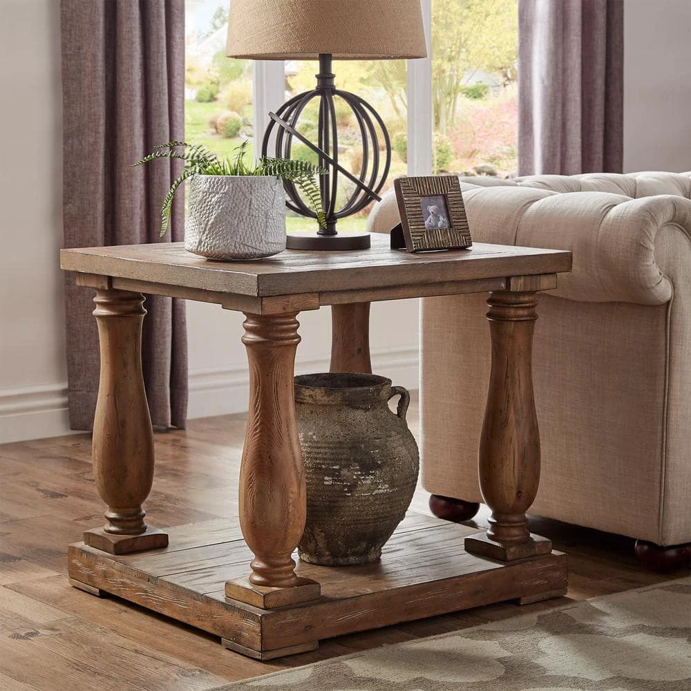 The Weston Home Dunbar collection may be just the piece of furniture you are looking for. This Pedestal end table is not only rustic and fashionable but functionable. The veneered surface gives this end table a stunning unique look. The baluster table legs add a rustic design element to the end table. This Dunbar collection is a must have addition to your living room, dining room, or even bedroom. The Weston Home Dunbar table is the perfect size and height for a bed side end table. The table features a lower shelf that can be used for additional storage or for a place to show off your favorite decor.