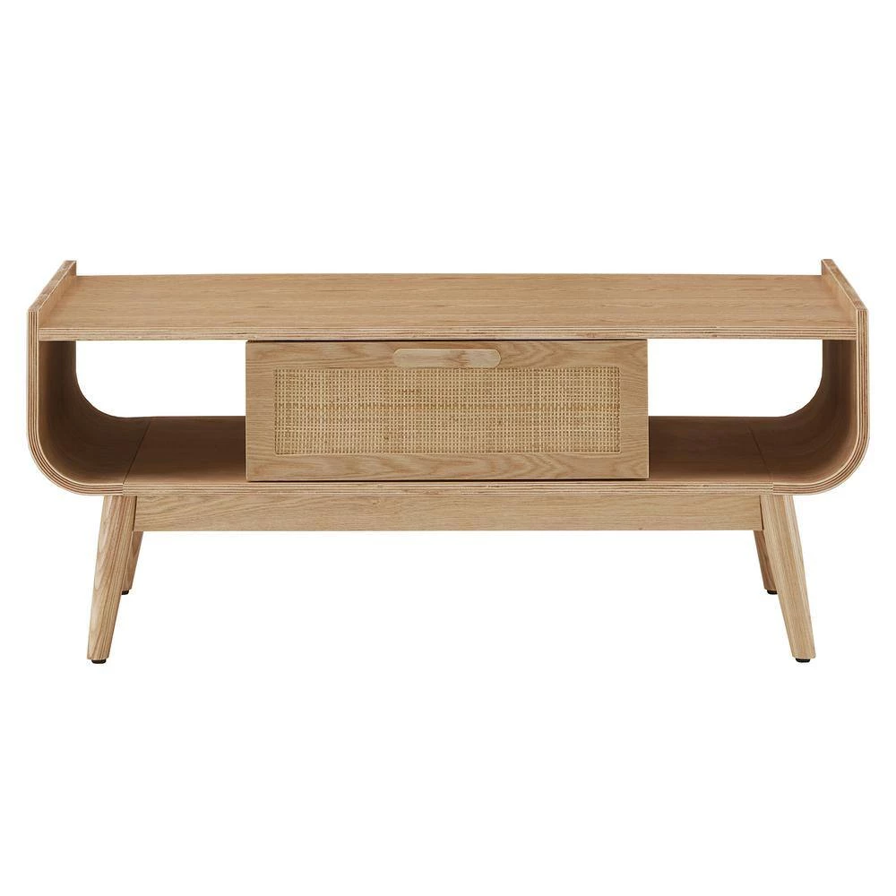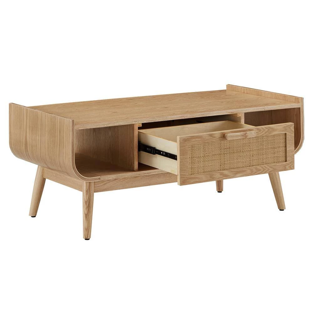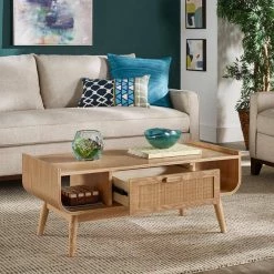 - Coffee table comes with one (1) self-closing drawer on ball-bearing glides and two (2) open shelves