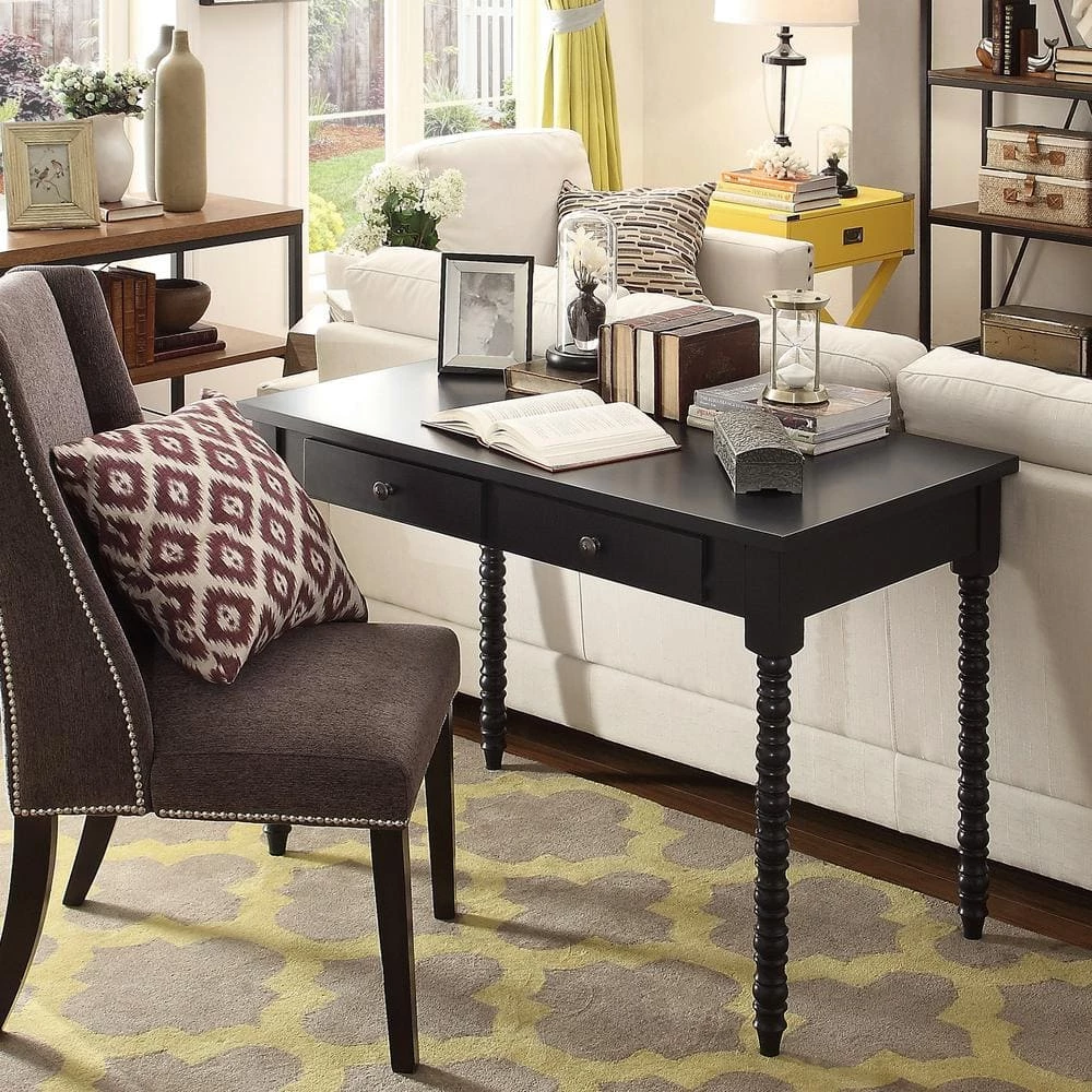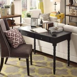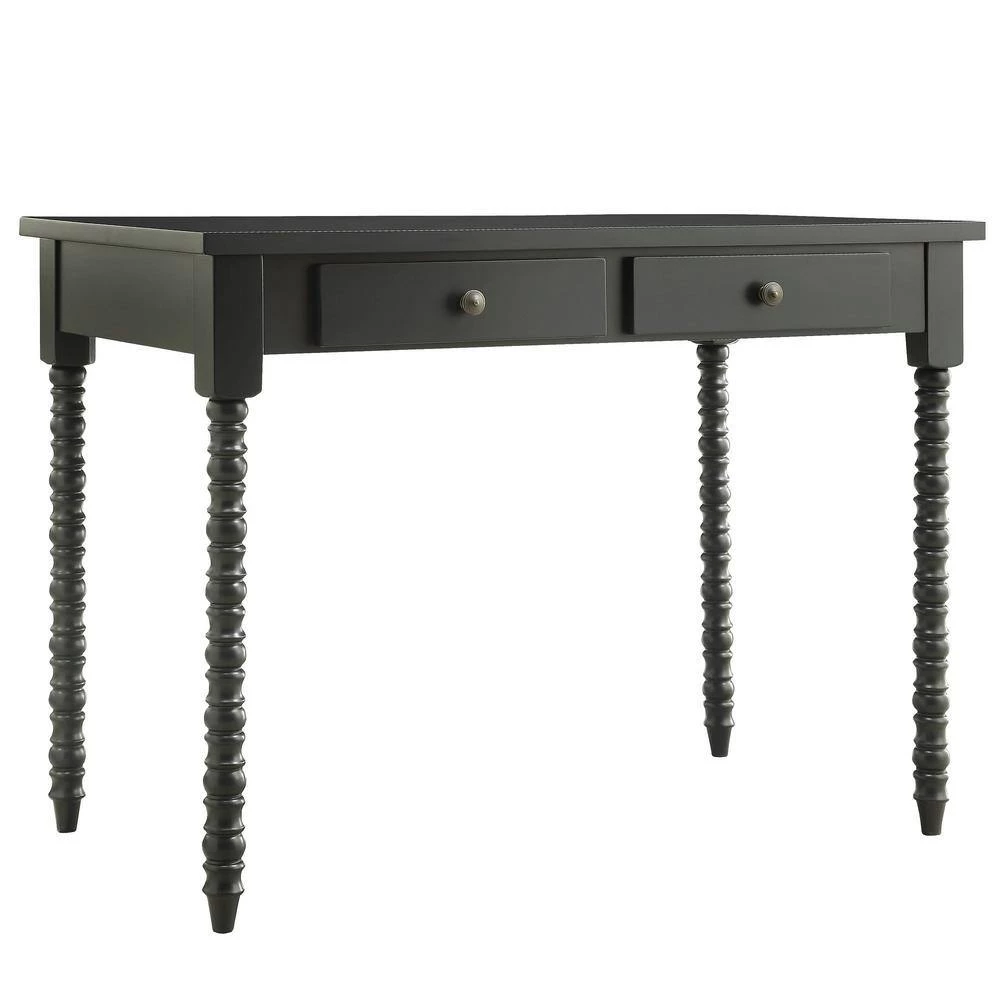 Create a unique look in your workspace with this 2-drawer Helix Legs Office Desk. Constructed from birch veneer for reliability, this bold desk features a large table top, two ample drawers, and unique helix legs. All your writing essentials and important documents are right at your fingertips, thanks to the hardwood knobs accenting each drawer. The helix legs foundation is eye-catching and lends some vintage flair that looks great in any setting. This piece comes in a variety of gorgeous colors that are sure to match your unique style.