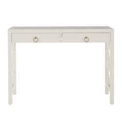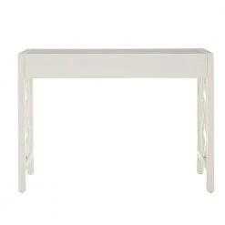 Anchor your workspace with an eye-catching piece with the 2-Drawer Writing Desk from HomeSullivan. Perfectly sized for any home, this gorgeous desk provides plenty of space for you to be productive. The smooth and rectangular table top offers ample surface space for spreading out your work while two generous drawers allow you to tuck away writing utensils and important documents. Brass finish ring drawer pulls ensure you always have access to your belongings and add a delicate touch to the chic piece. A quatrefoil cut-out design beautifully decorates the sides of this desk for eye-catching detail. Crafted from poplar wood for durability, this classic desk blends beautifully with cottage-themed settings and comes in a variety of neutral finish to match your design style.
