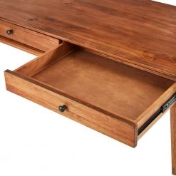 Are you looking to update your living room with a stylish piece of furniture? This natural brown coffee table features a fashionable open concept design. The pull knob and support brackets match perfectly with the tone of the natural wood of hardwood floors or carpet. This table is built with functionality in mind for everyday use. The twin drawer design can store your TV remotes, note pads, pens, and other everyday items out of sight. The drawers are equipped with metal brackets that will provide the durability of everyday use.