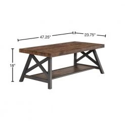 Give your living space that homey feel with the Ovroy Cocktail Table With Shelf. The bottom shelf provides a space to display all your favorite home goods and novelties, while the geometrically shaped legs add styled detail to this basic piece. The rustic wood finish lends a farmhouse theme that ties any room together perfectly.