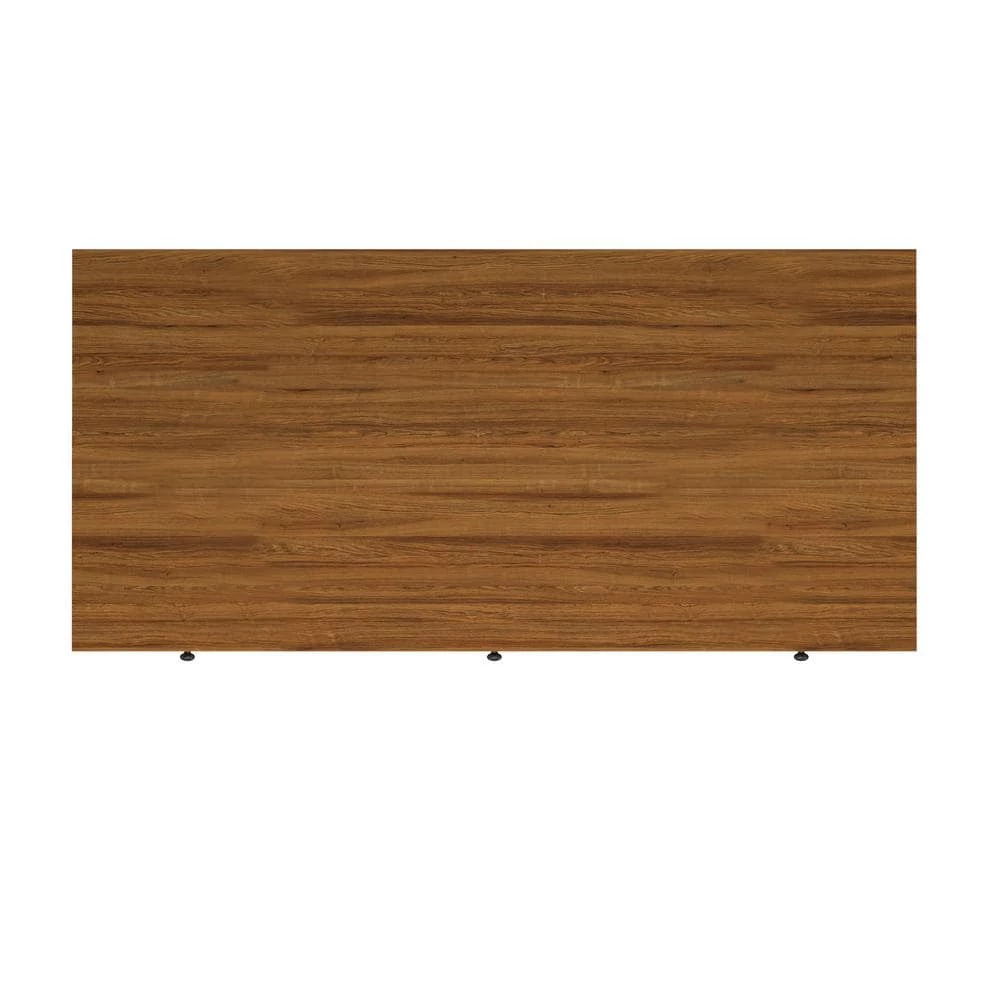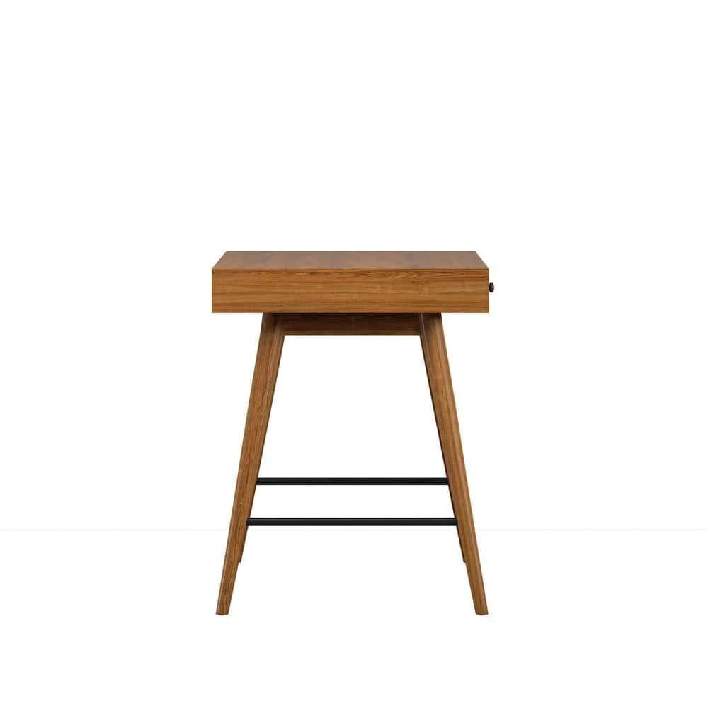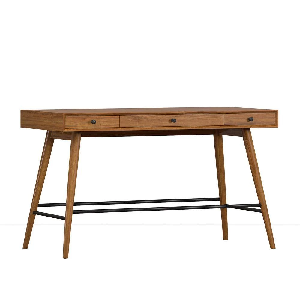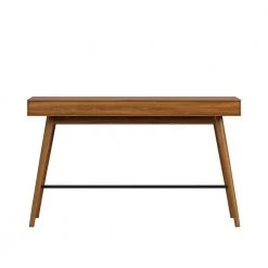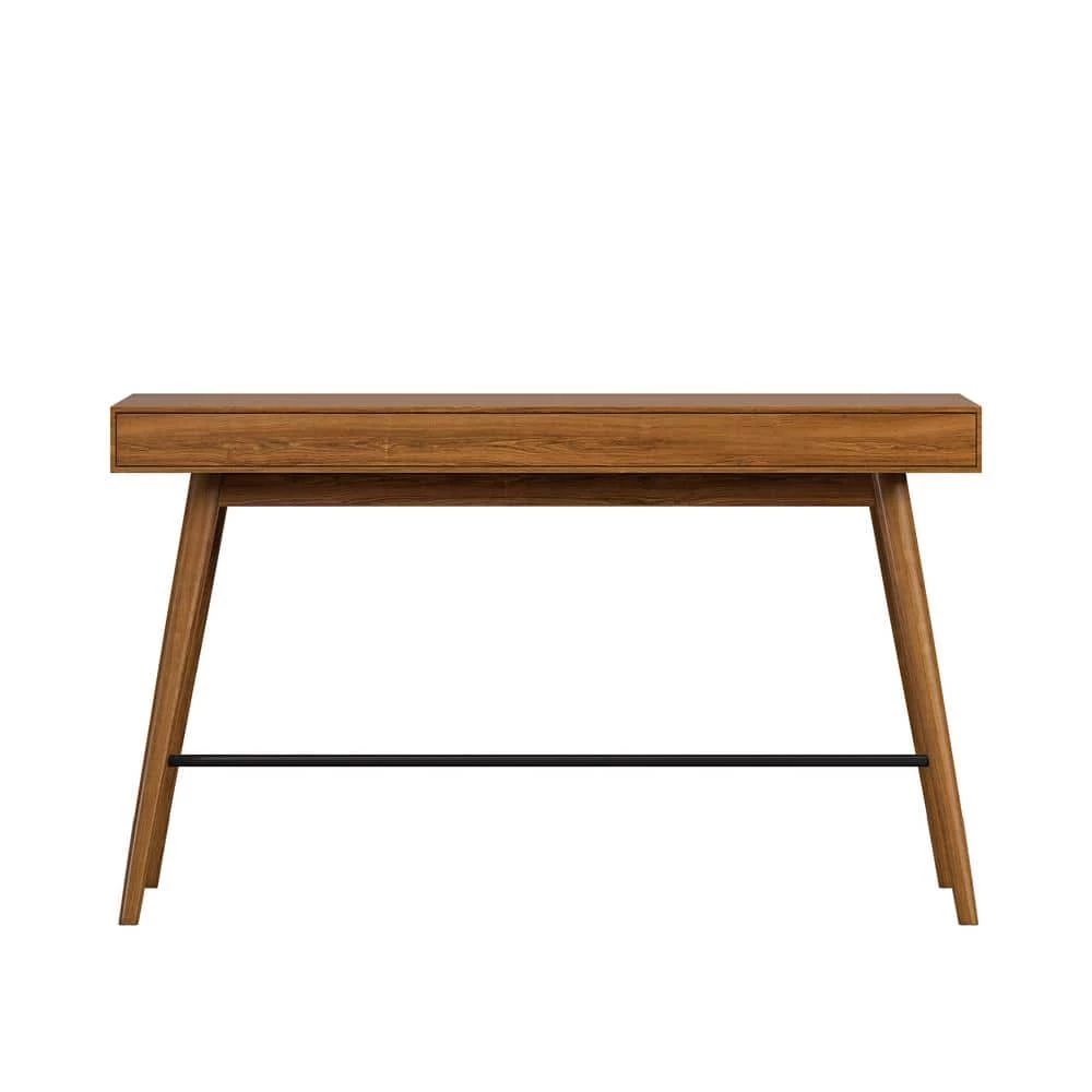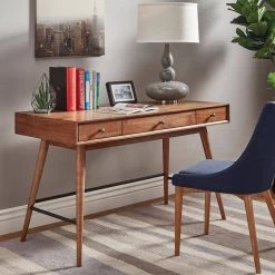 Anchor your home office or study space in mid-century modern style with this streamlined writing desk. Crafted of solid rubberwood and manufactured wood with acacia veneers, this desk strikes a clean-lined rectangular silhouette on a trestle base with four flared dowel legs. Featuring antique bronze hardware, three drawers offer out-of-sight storage for files, folders, and office supplies, while the expansive desktop provides a perfect platform for your laptop and accessories.