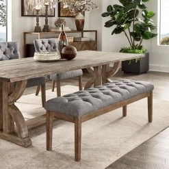 Get this upholstered bench for your entryway or dining area. Its stable construction ensures safety and durability. Up top, button-tufted linen upholstery with a neutral solid hue ties it all together. Available in multiple upholstery color options, this contemporary bench is ideal for a variety of decors. The reclaimed stain adds a vintage touch, and works beautifully with any finishes.