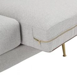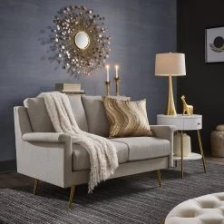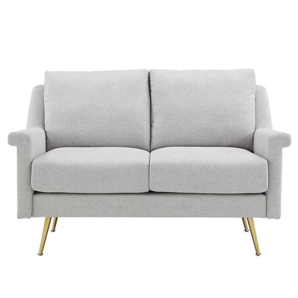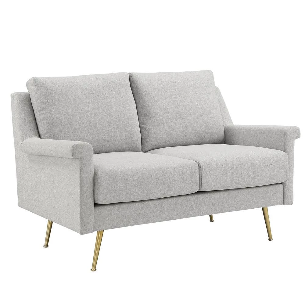 This Grey Fabric Loveseat with Gold Metal Legs completes any contemporary, urban-themed living space. Do not be fooled by the minimalist look of this loveseat-it is sure to deliver long-lasting comfort and relaxation. Plush cushions are filled with foam and upholstered in soft grey fabric to offer a warm and cozy spot for intimate conversations with loved ones. Subtle details come from the rolled arms while the gold-finished legs create a striking contrast against the grey fabric for a look that is eye-catching yet not overwhelming.