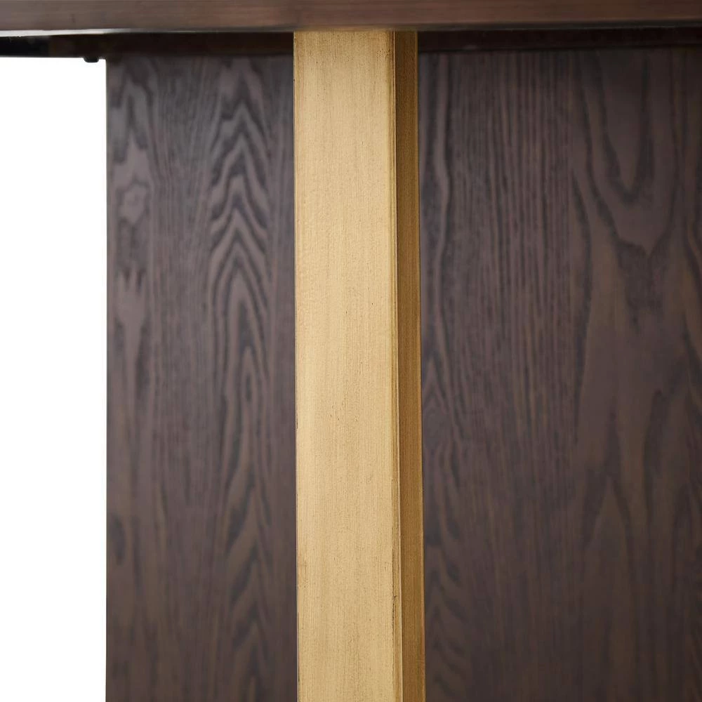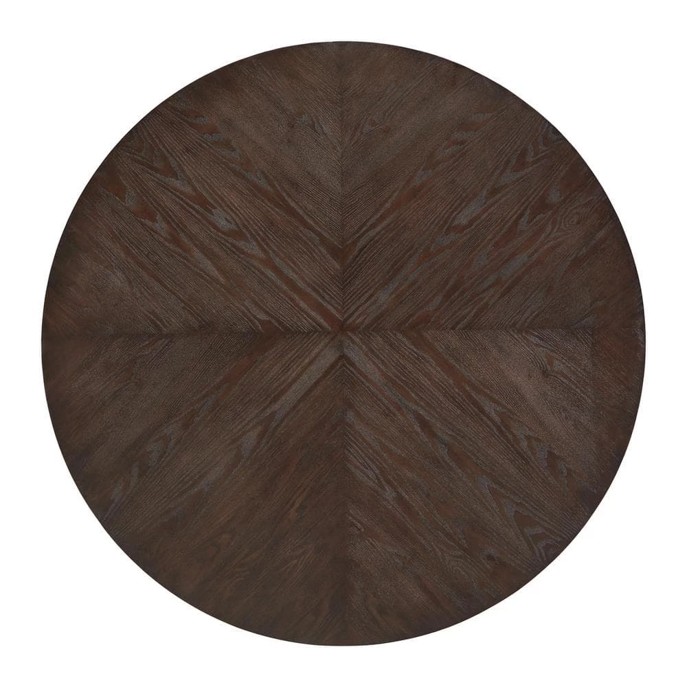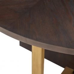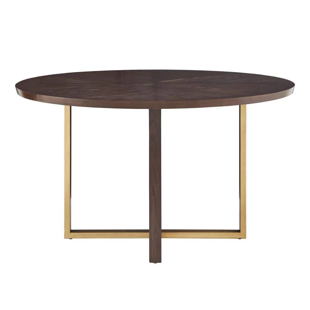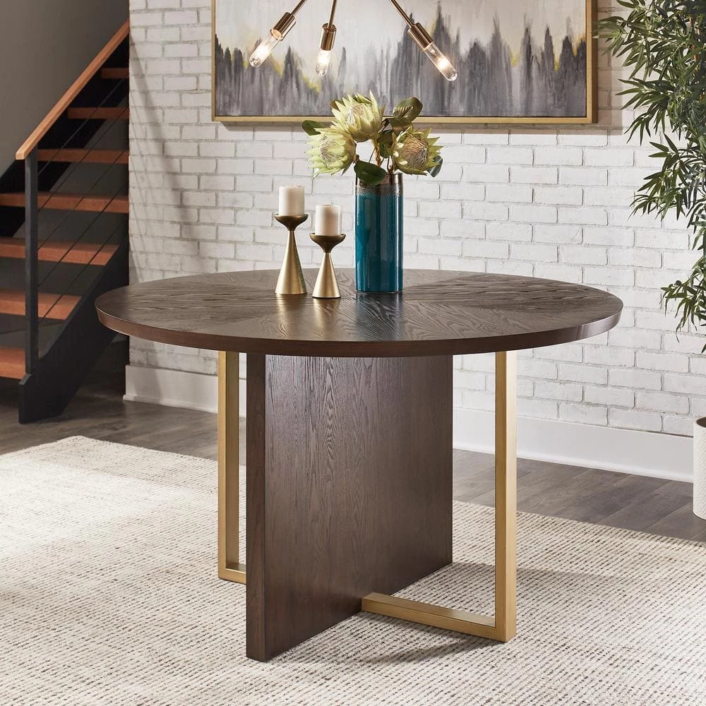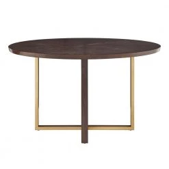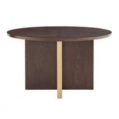 The Espresso 54 in. Round Dining Table by HomeSullivan updates your formal dining room with contemporary elegance. Coming in a warm, espresso finish, this sturdy table features a stunning inlay design on the oak veneer table top and gold metal bars to make this piece truly unique. This reliable table is crafted from rubberwood, making it easy to clean yet hard to scratch.
