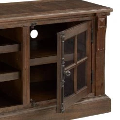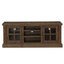 Add a piece that is sure to be an instant classic in your living space with the Brown Wire Brushed Finish TV Stand from HomeSullivan. Storage is aplenty with this versatile piece, as it comes with three shelves for open storage and two cabinets for more concealed storage. Each cabinet is equipped with a shelf and showcases a lovely, glass windowpane door. A warm, brown, wire brushed finish completes the piece, delivering some timeless rustic charm, perfect for farmhouse design styles. This traditional TV stand boasts a reliable pine construction for long-lasting durability throughout years of use.