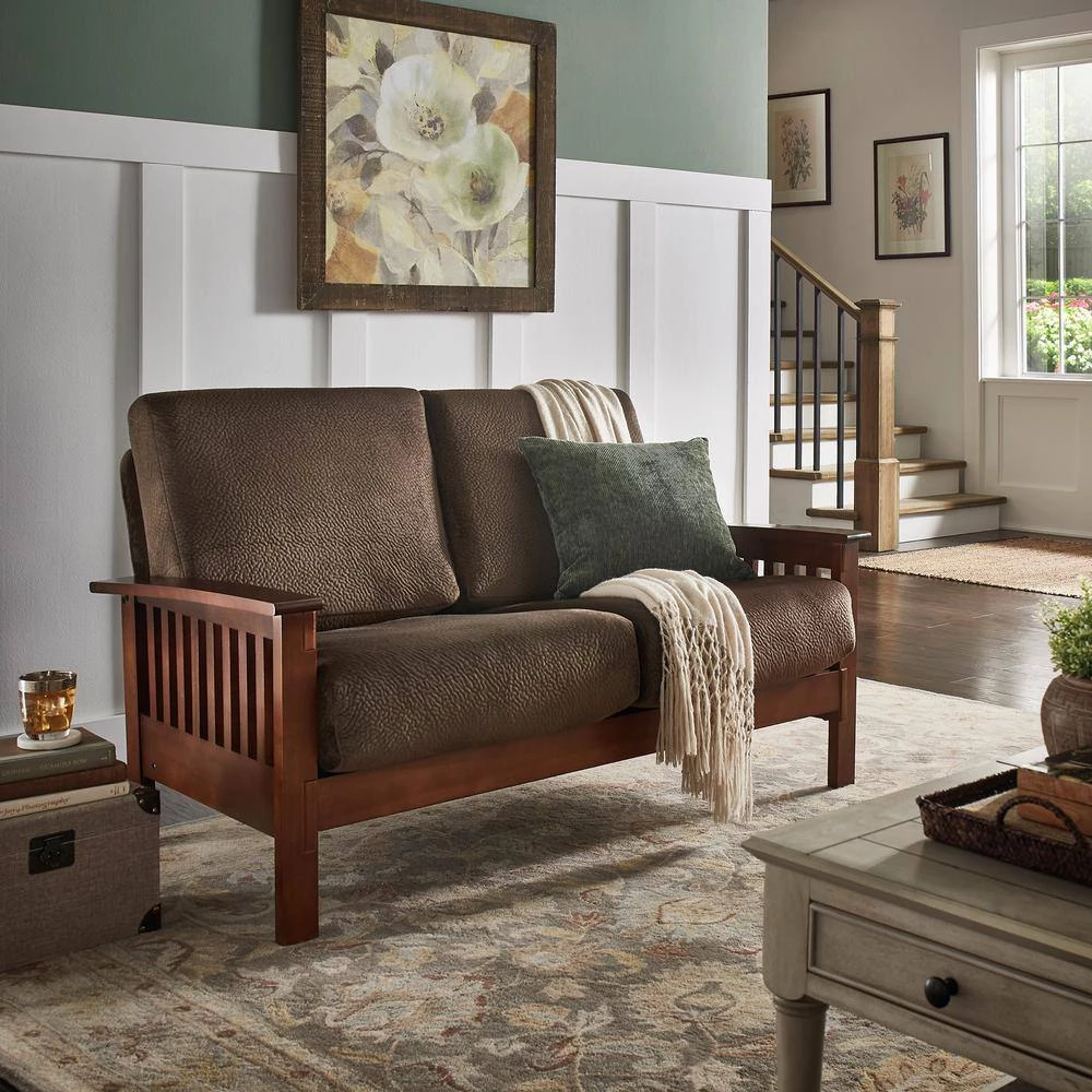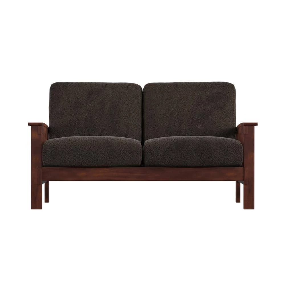 This Mission Loveseat highlights casual mission style elegance for your home. This loveseat is great for family meals or when company comes. Your Loveseat features a clean design that can work in any setting. This loveseat is made of solid wood construction with veneers will last for years of use. The durable fabric has a removable cushion; this Mission Loveseat will be the most comfortable seat in the house. Your Mission Loveseat is made with quality construction, mission brown finish and solid Asian rubber wood frames. Assembly required. Hardware included.