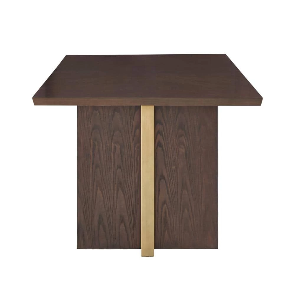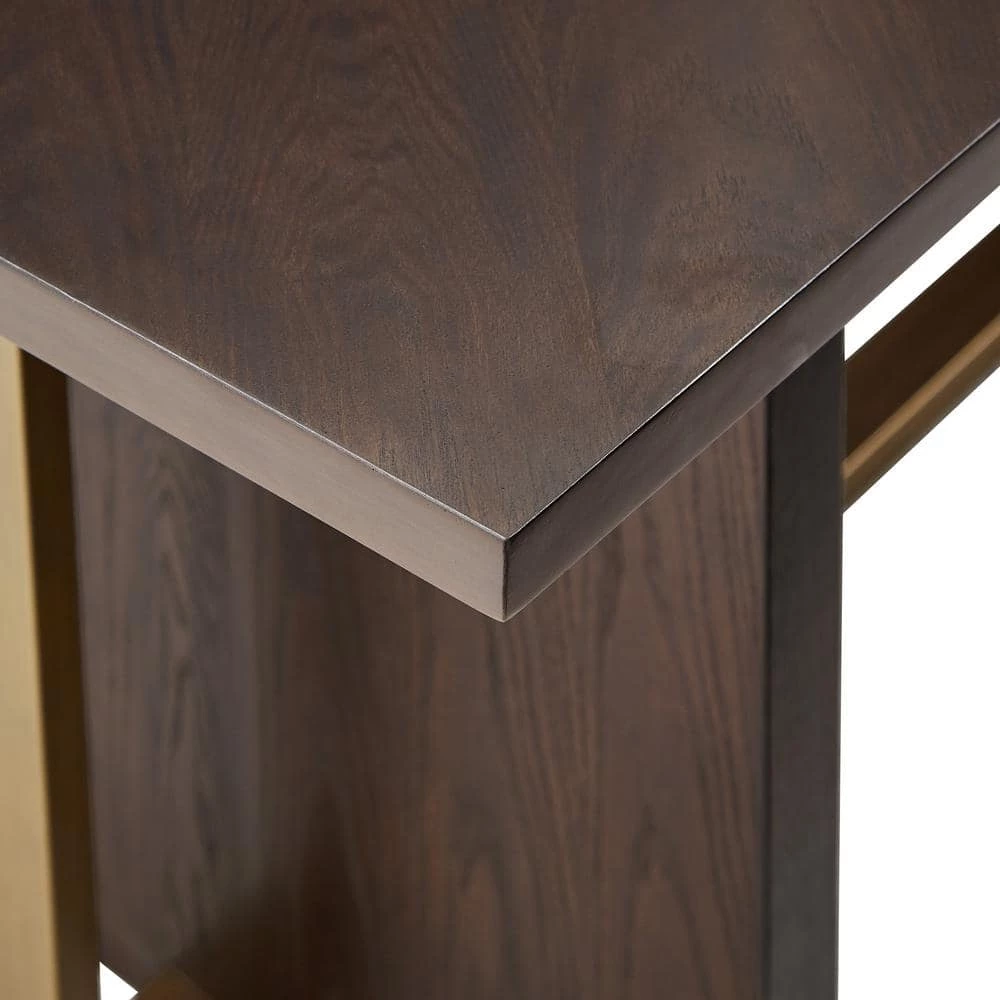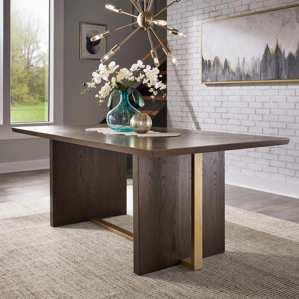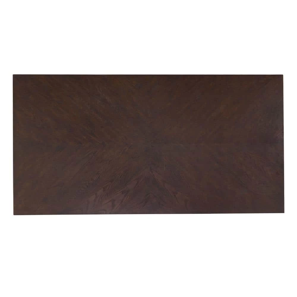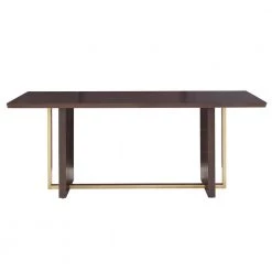The Espresso 78 in. Rectangular Dining Table by HomeSullivan updates your formal dining room with contemporary elegance. Coming in a warm, espresso finish, this sturdy table features a stunning inlay design on the oak veneer table top and gold metal bars to make this piece truly unique. This reliable table is crafted from rubberwood, making it easy to clean yet hard to scratch.