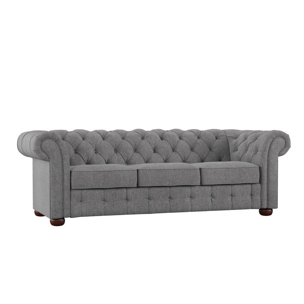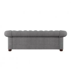 The Tufted Scroll Arm Chesterfield Sofa is sumptuously dressed in upholstery and offered in a neutral hue. For a timeless chesterfield silhouette, this sofa has generously rolled arms and a matching back, both rich with button tufting. It’ s comfortably cushioned, offers room to seat three, and sits on wood bun feet.
