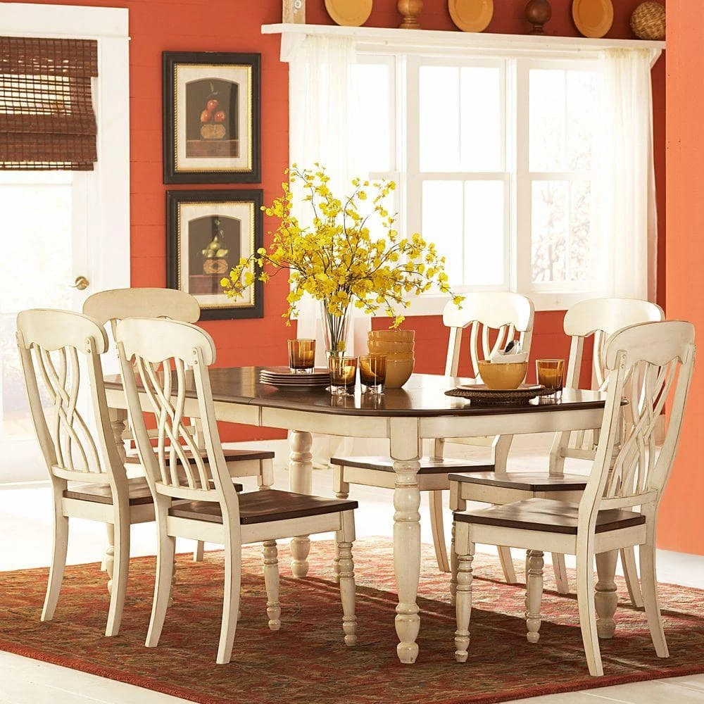 - Showcases an elegant antique white finish beautifully offset by distressed cherry