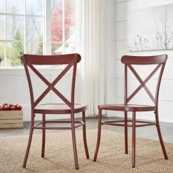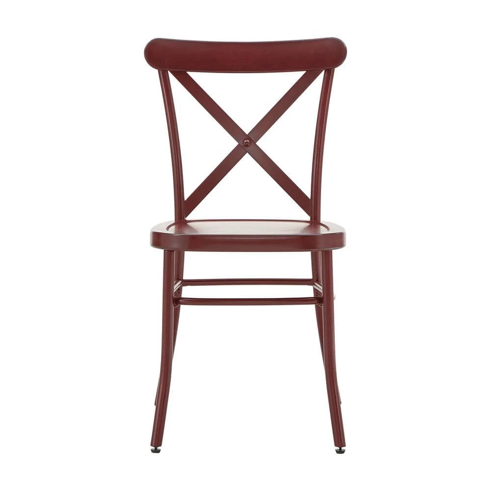 Sleek construction meets a classic design to make up the metal dining chairs. These metal chairs feature a rustic, wood-like appearance and an X-cross chair back, making it the perfect, charming addition to a classic or farmhouse styled home. The streamlined design and lightweight build of these chairs make them perfect for everyday use, while a contoured seat offers overall comfort to family and guests as they dine. Choose from various antique colors and finishes to mix and match your dining setting.