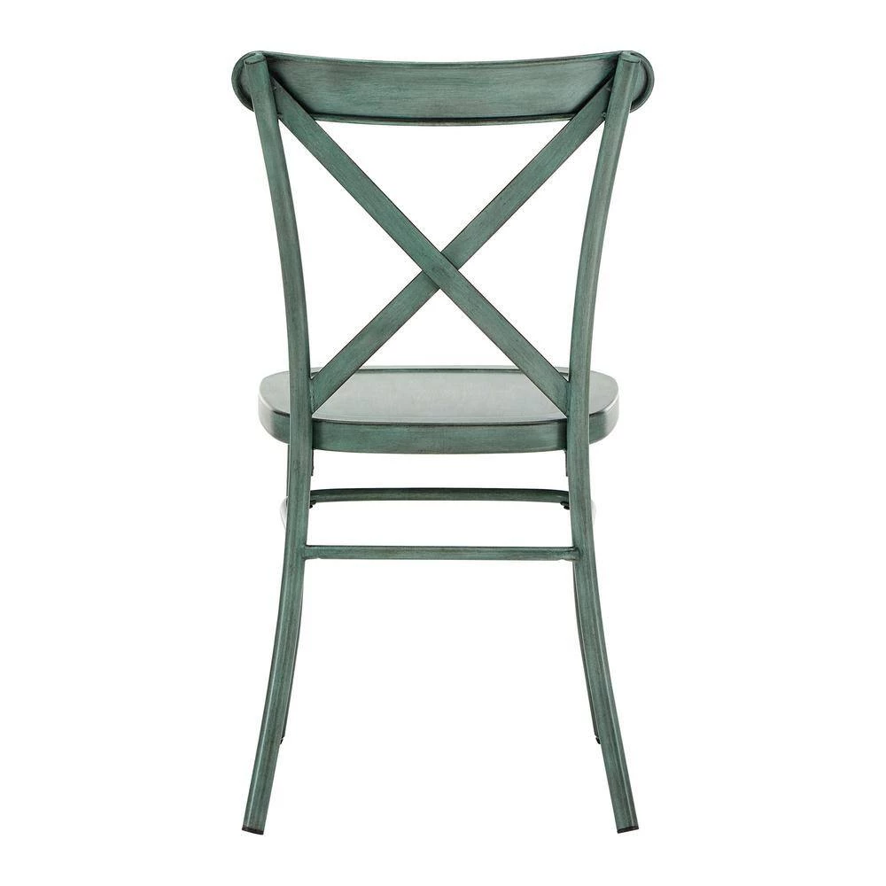 Sleek construction meets a classic design to make up the metal dining chairs. These metal chairs feature a rustic, wood-like appearance and an X-cross chair back, making it the perfect, charming addition to a classic or farmhouse styled home. The streamlined design and lightweight build of these chairs make them perfect for everyday use, while a contoured seat offers overall comfort to family and guests as they dine. Choose from various antique colors and finishes to mix and match your dining setting.