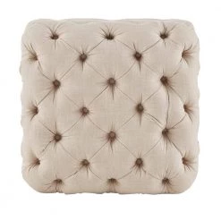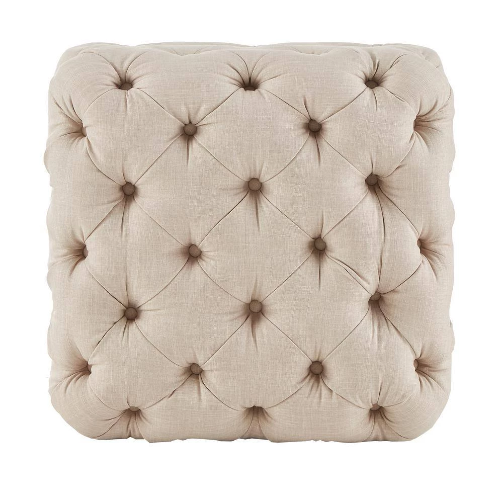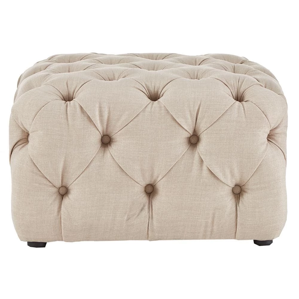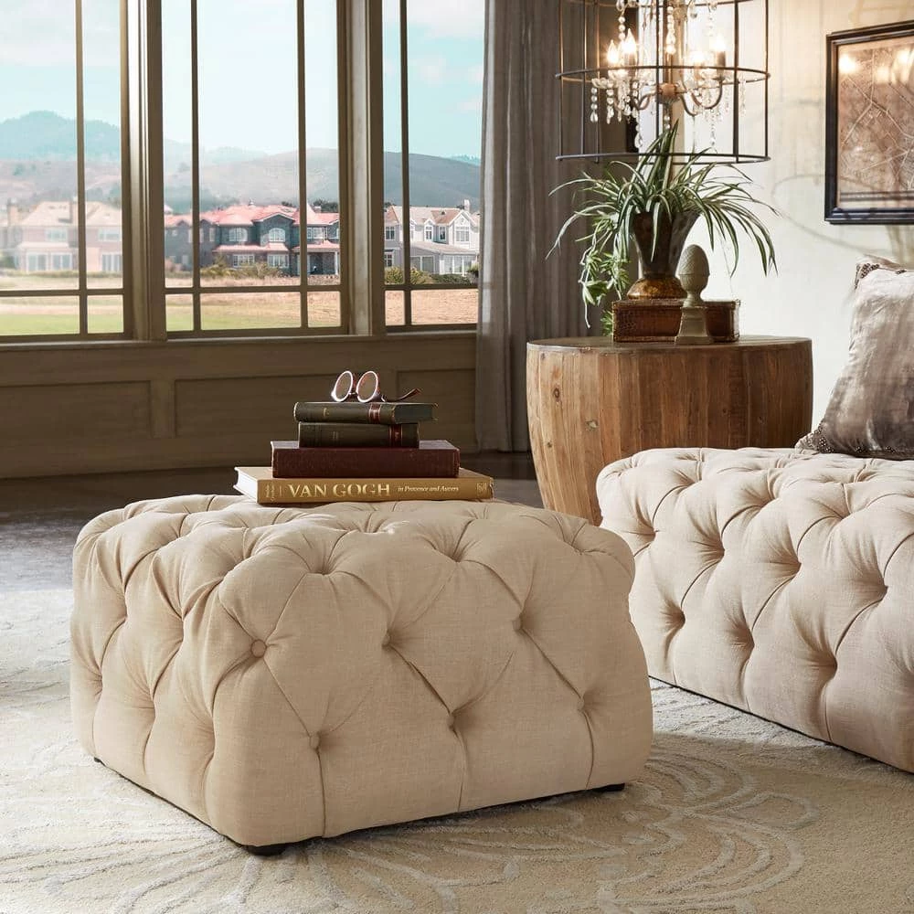 Sink your feet into exquisite comfort when you use this opulent ottoman. A sustainably sourced rubberwood frame ensures long-lasting, reliable performance. Plump, button-tufted linen upholstery covers high-density foam to provide soft yet firm support for tired legs, and the four casters make this ottoman a breeze to move.