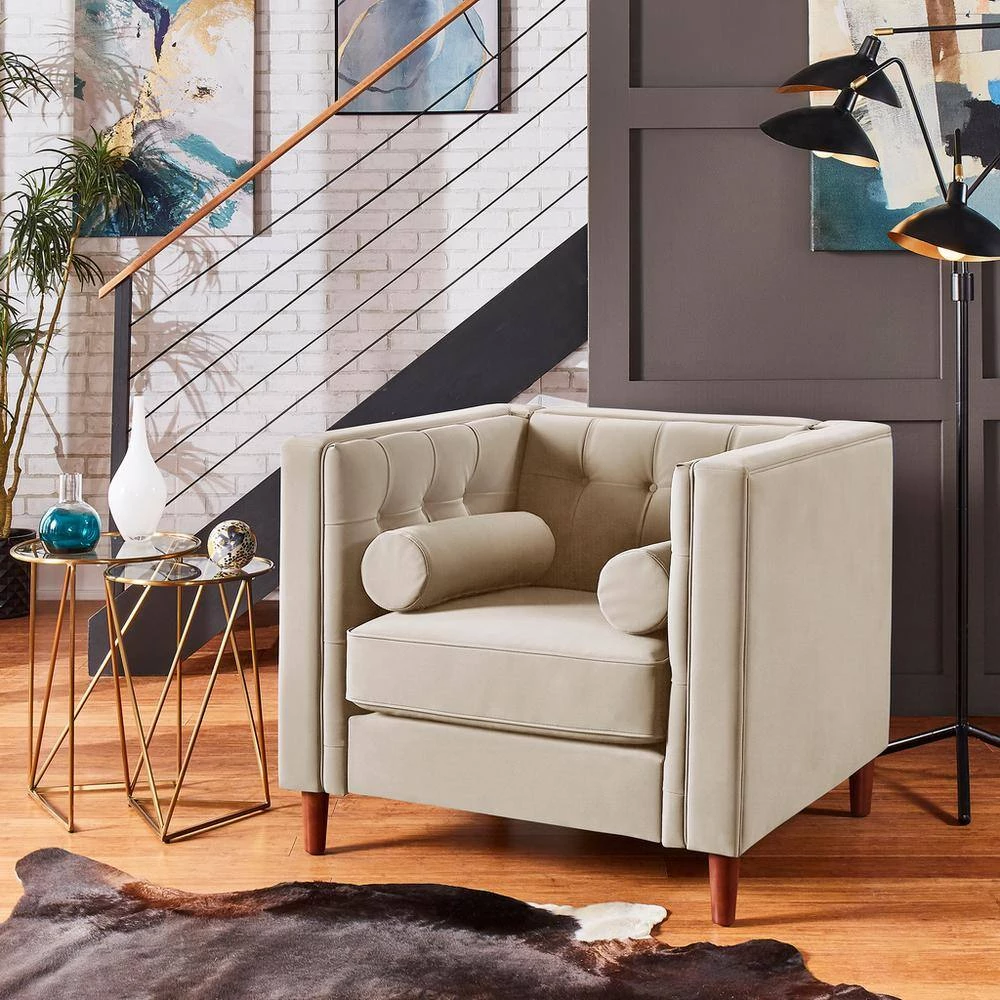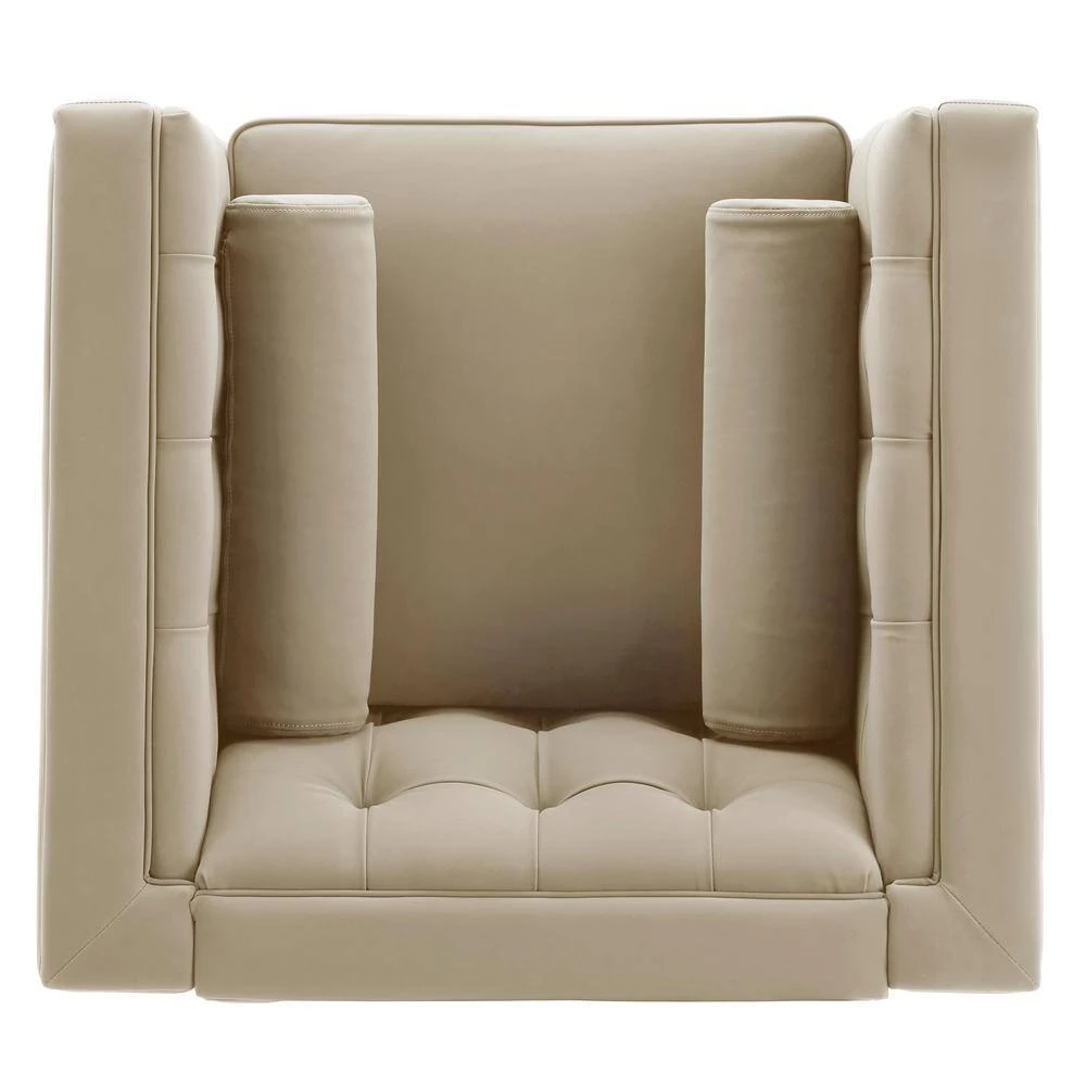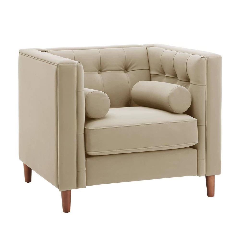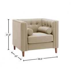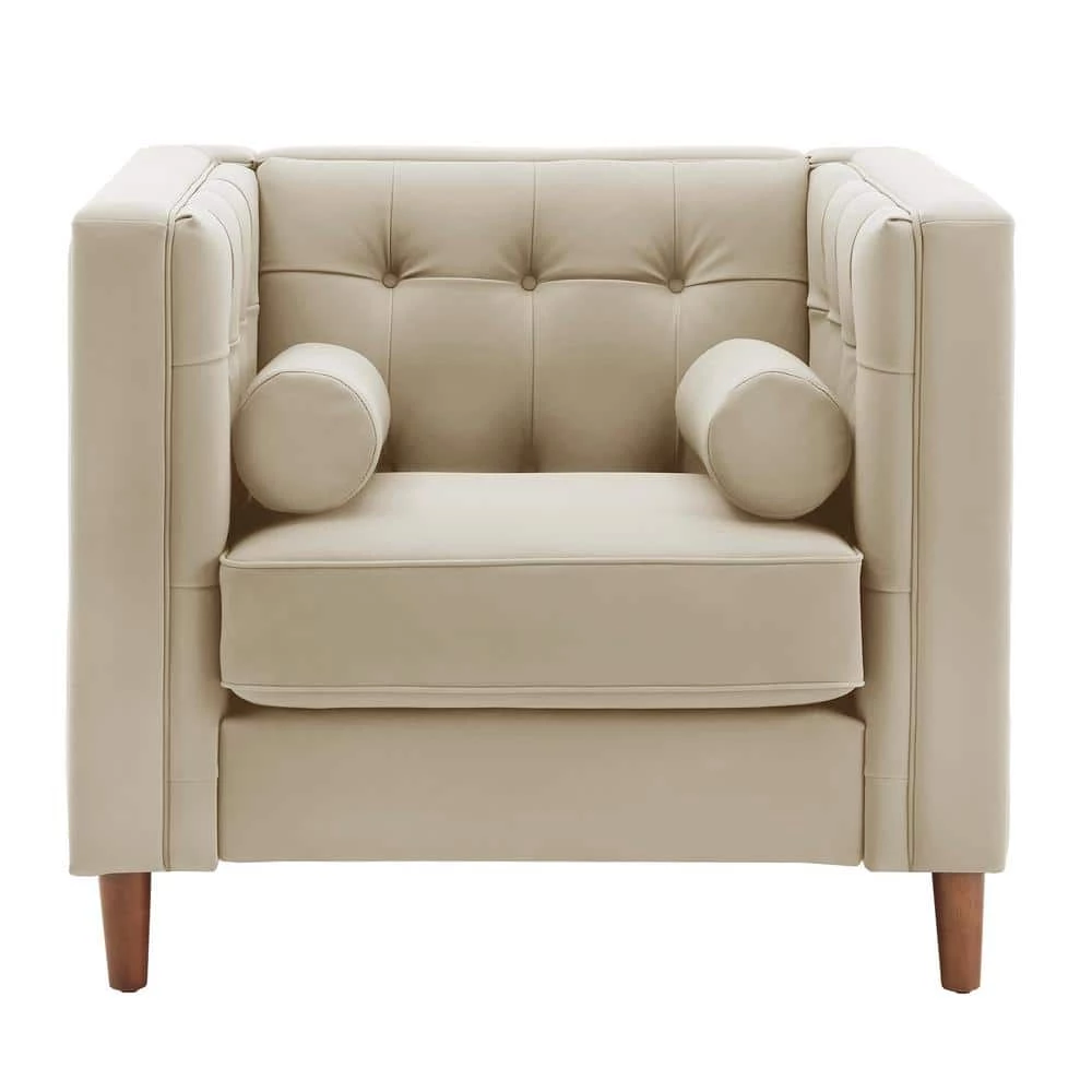 Accent your bold, mid-century style with the Beige Tuxedo Faux Leather Arm Chair. This lavish chair features beautiful button tufting on the back and arms. The cushions are filled with plush foam for lasting comfort. Founded on peg legs, this chair is crafted with durable rubber wood for everyday use.