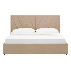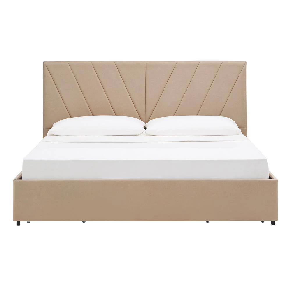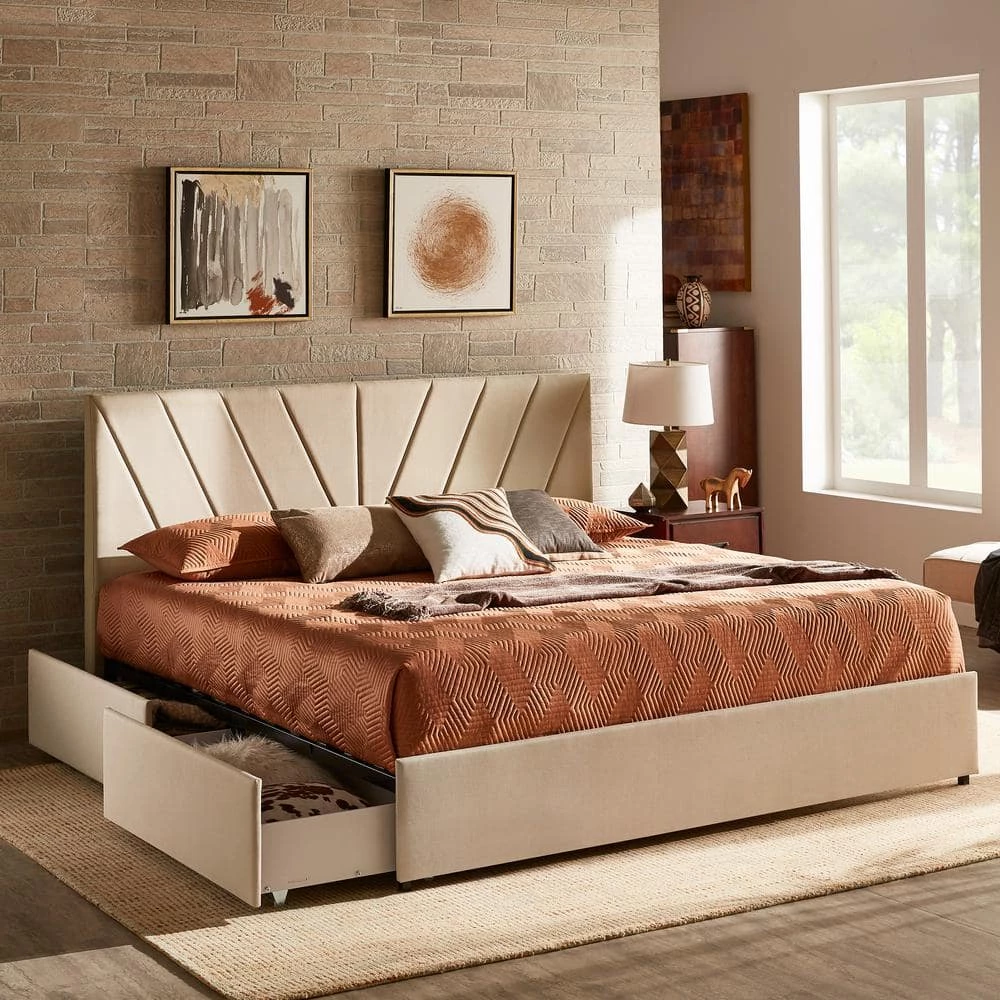 The V-Channel Headboard Storage Platform Bed by HomeSullivan is a stylish addition to any bedroom. This bed displays a channel-style headboard in a V shape for visual interest. Beige linen upholstery softens the piece yet adds sophistication. Store all your bedroom essentials in the four spacious drawers. A sturdy wooden construction will have you sleeping soundly for years to come.