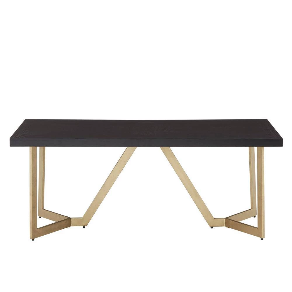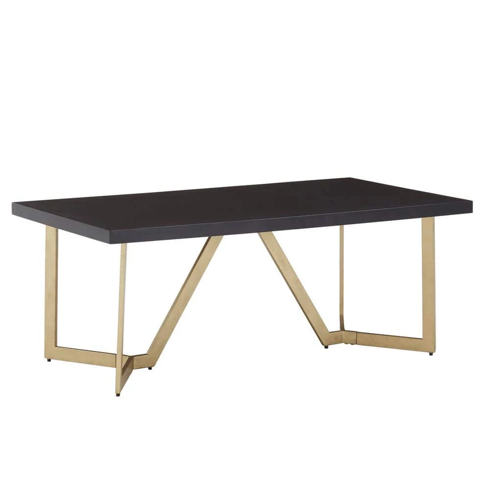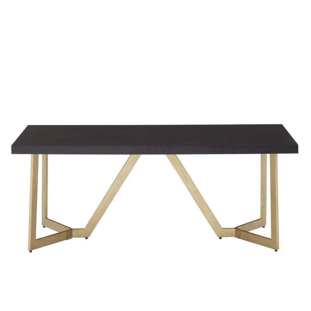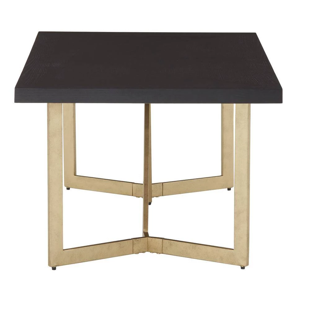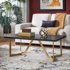 The Black and Gold Metal Base Coffee Table updates your living room in stylish and bold fashion. Showcasing show-stopping design, this luxurious table works great in modern or glam-inspired settings. Constructed from pine and metal for long-lasting durability. Shiny gold metal bases stunningly contrast black wooden table top for striking appeal. The black table top features a diamond-like inlay design for some lovely rustic flair.