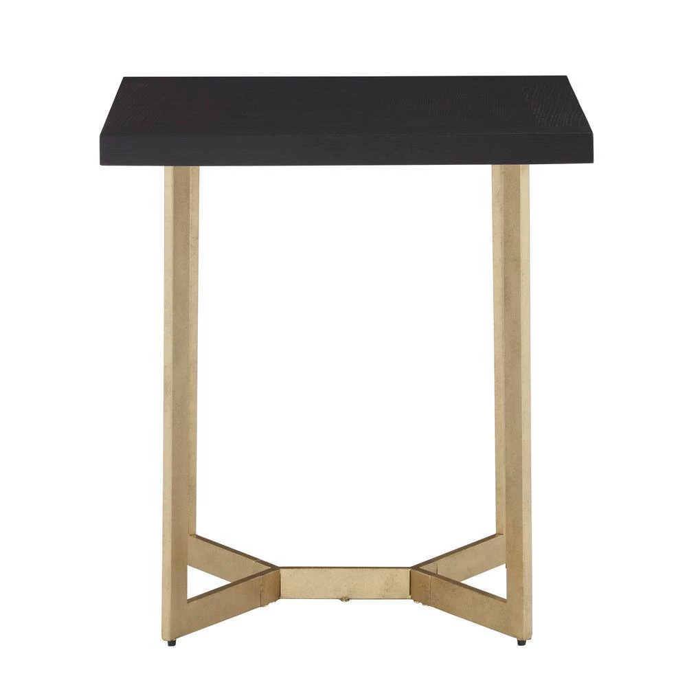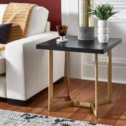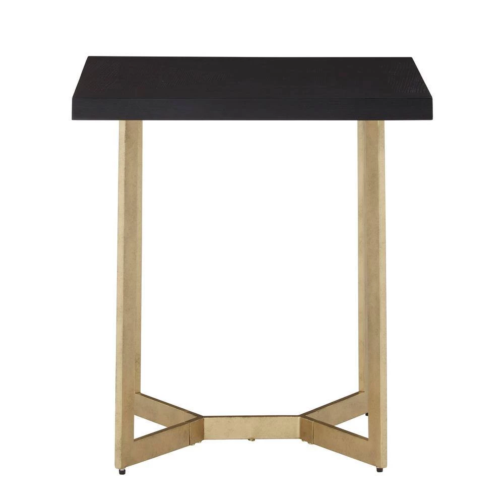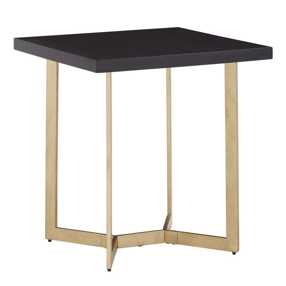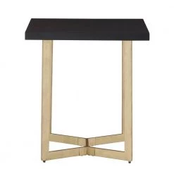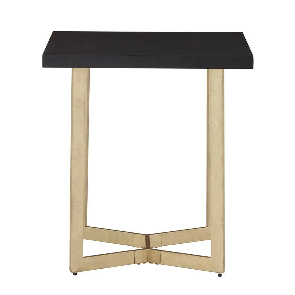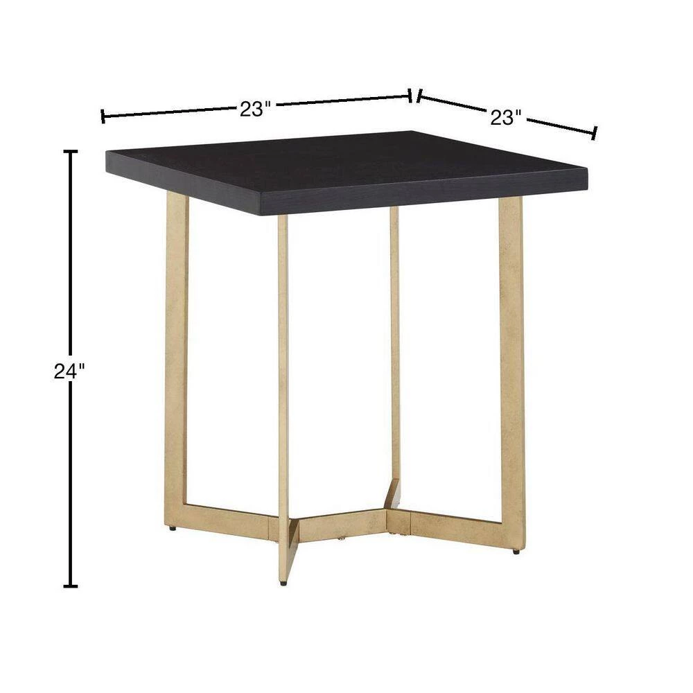 The Marquis Black and Gold Metal Base End Table updates your living room in stylish and bold fashion. Showcasing show-stopping design, this luxurious end table works great in modern or glam-inspired settings. This piece is constructed from pine and metal for long-lasting durability. A shiny gold metal base stunningly contrasts black wooden table tops for striking appeal. The black table top features a diamond-like inlay design for some lovely rustic flair.