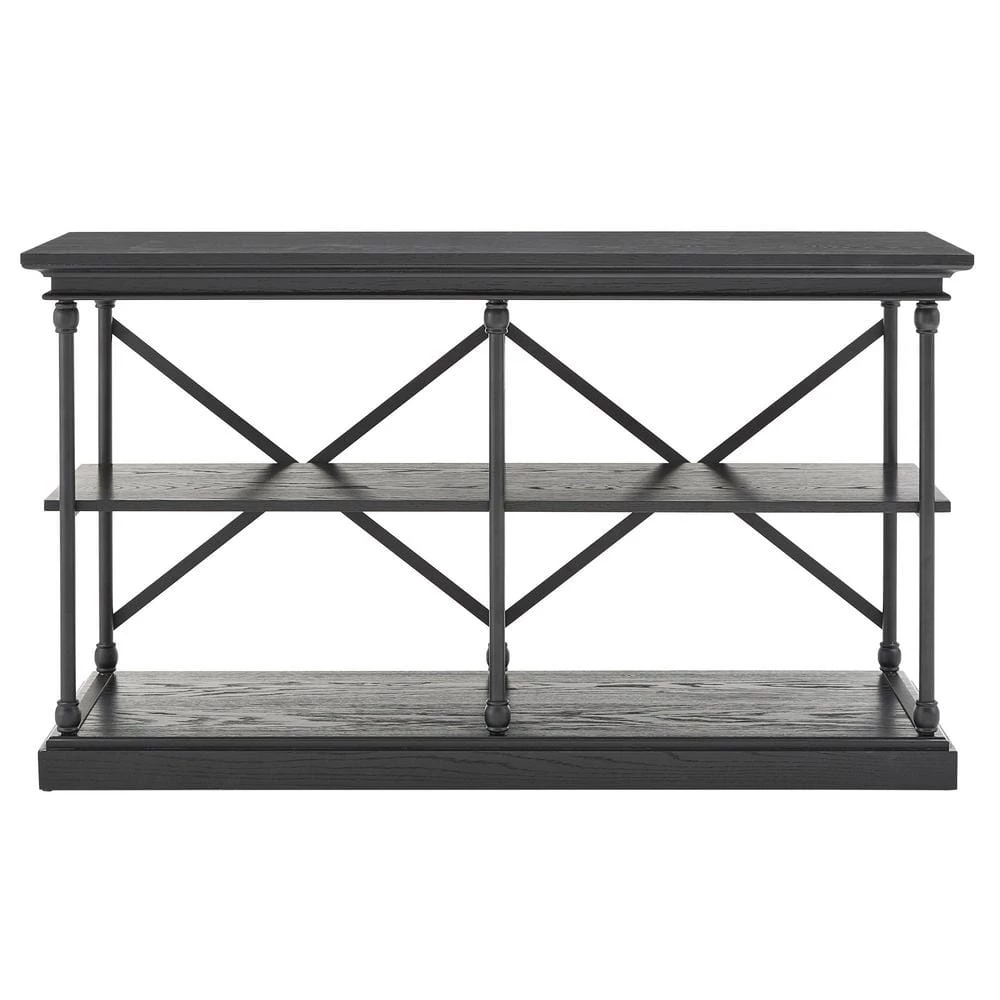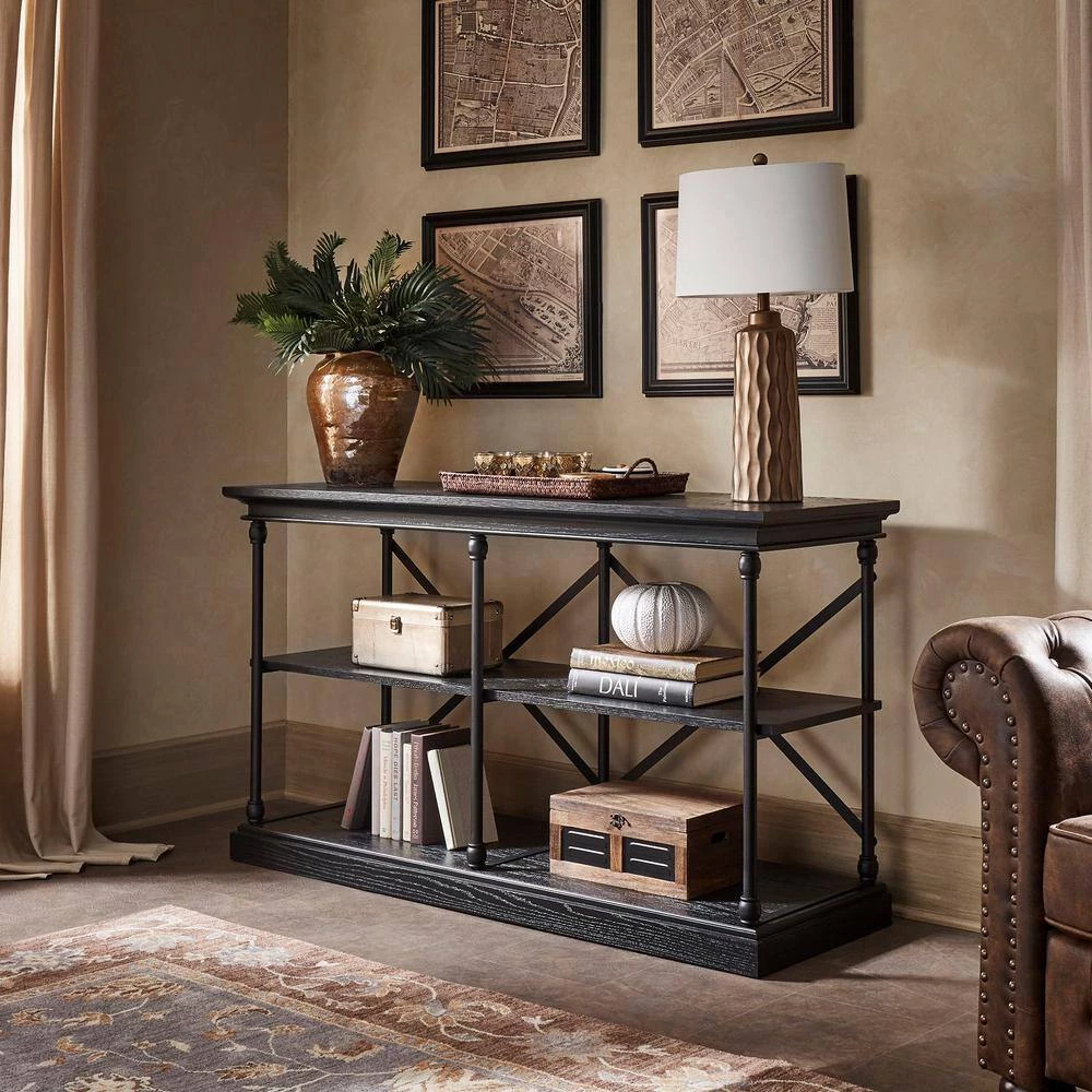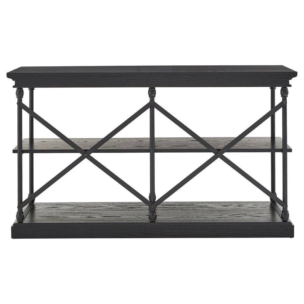 Add industrial flare to your living room with the HomeSullivan X-Back Sofa Table. With a powder coated black metal frame and classic construction, this table is sure to add some charm to your space. The two open shelves offer a place for decorative items, consoles and more. Metal X-cross detailing provides styled accenting to this table.