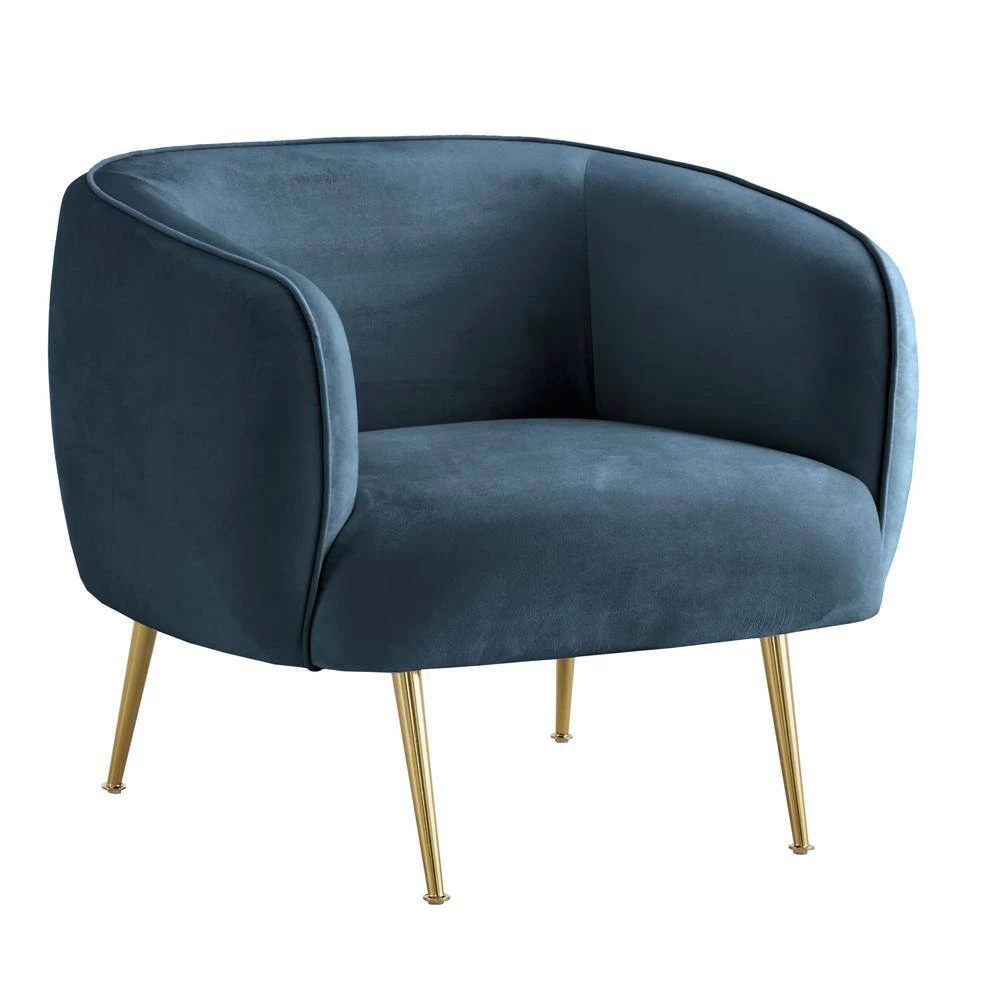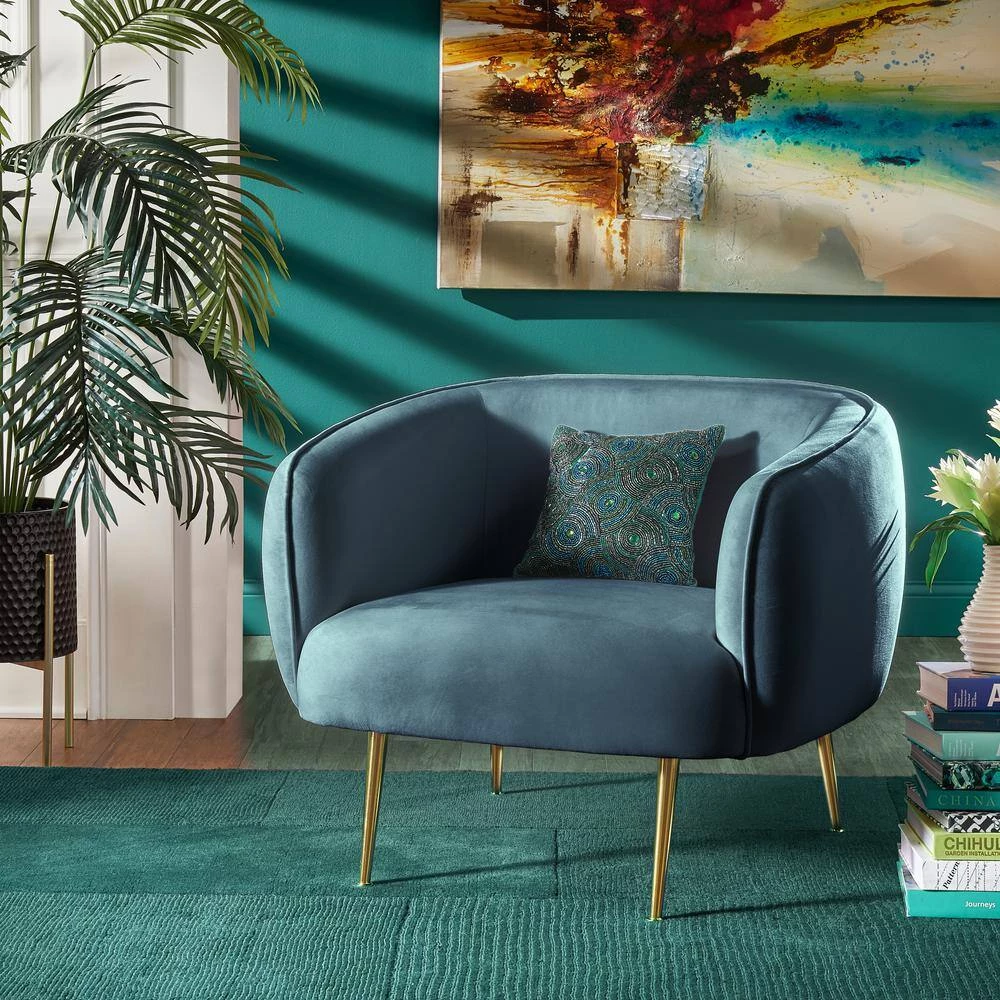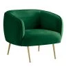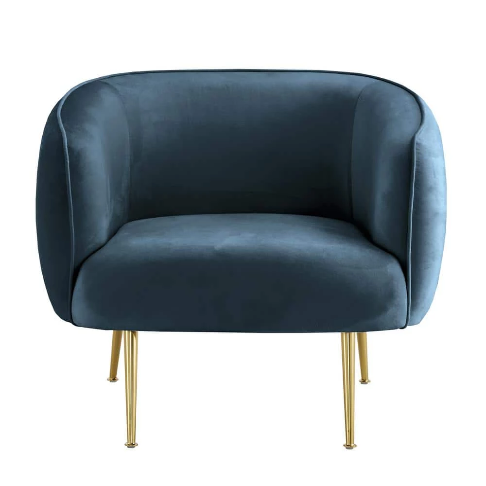 The Brass Finish Velvet Upholstered Accent Chair delivers that perfect look of elegance and extravagance to any living space. This cloudlike accent chair makes a bold statement in a graceful, curved silhouette. Foam-filled cushions are upholstered in rich velvet for exquisite comfort and comes in your choice of color. The tapered legs are finished in a shiny brass for a glitzy touch that beautifully ties the whole glam look together. This luxurious chair is constructed with tough wood and metal tube for lasting support and durability.