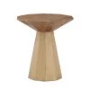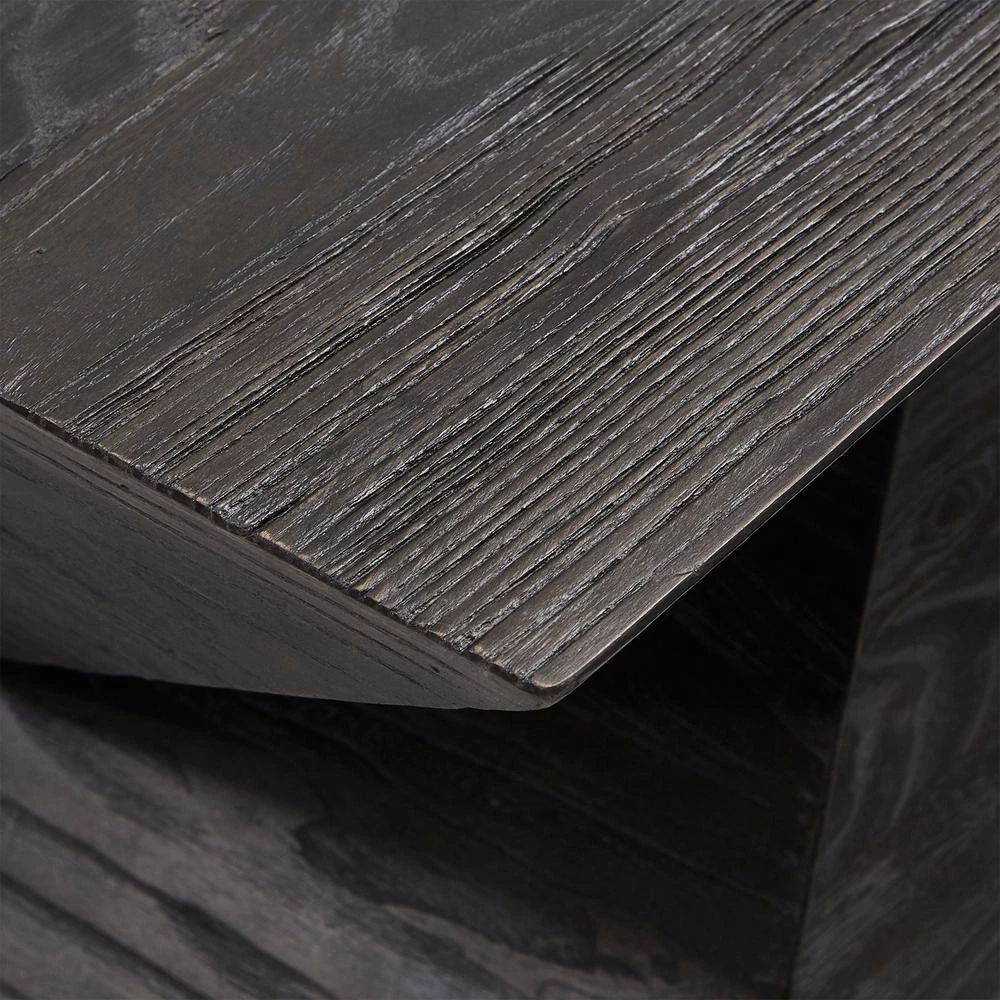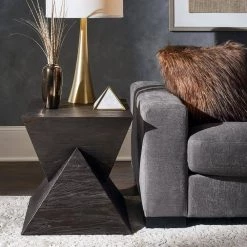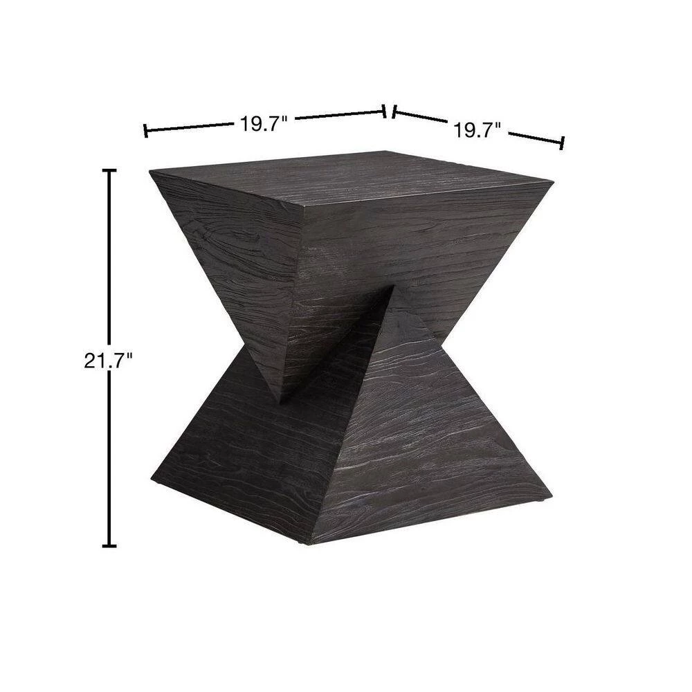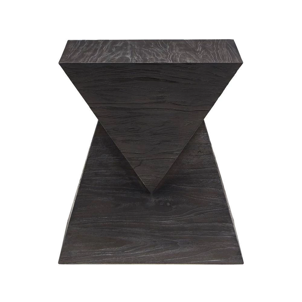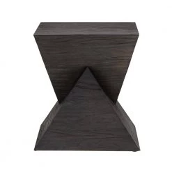 Give your home a stunning, new edge with the Distressed Double Triangular Prism Shape End Table. Your guests will be wowed by the modern appearance of this end table with the clean lines and smooth surfaces of the geometric design. With a distressed, wood grain finish, this end table delivers a touch of Old World vibes. A sturdy new elm and solid wood construction ensures lasting resiliency for years to come.