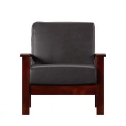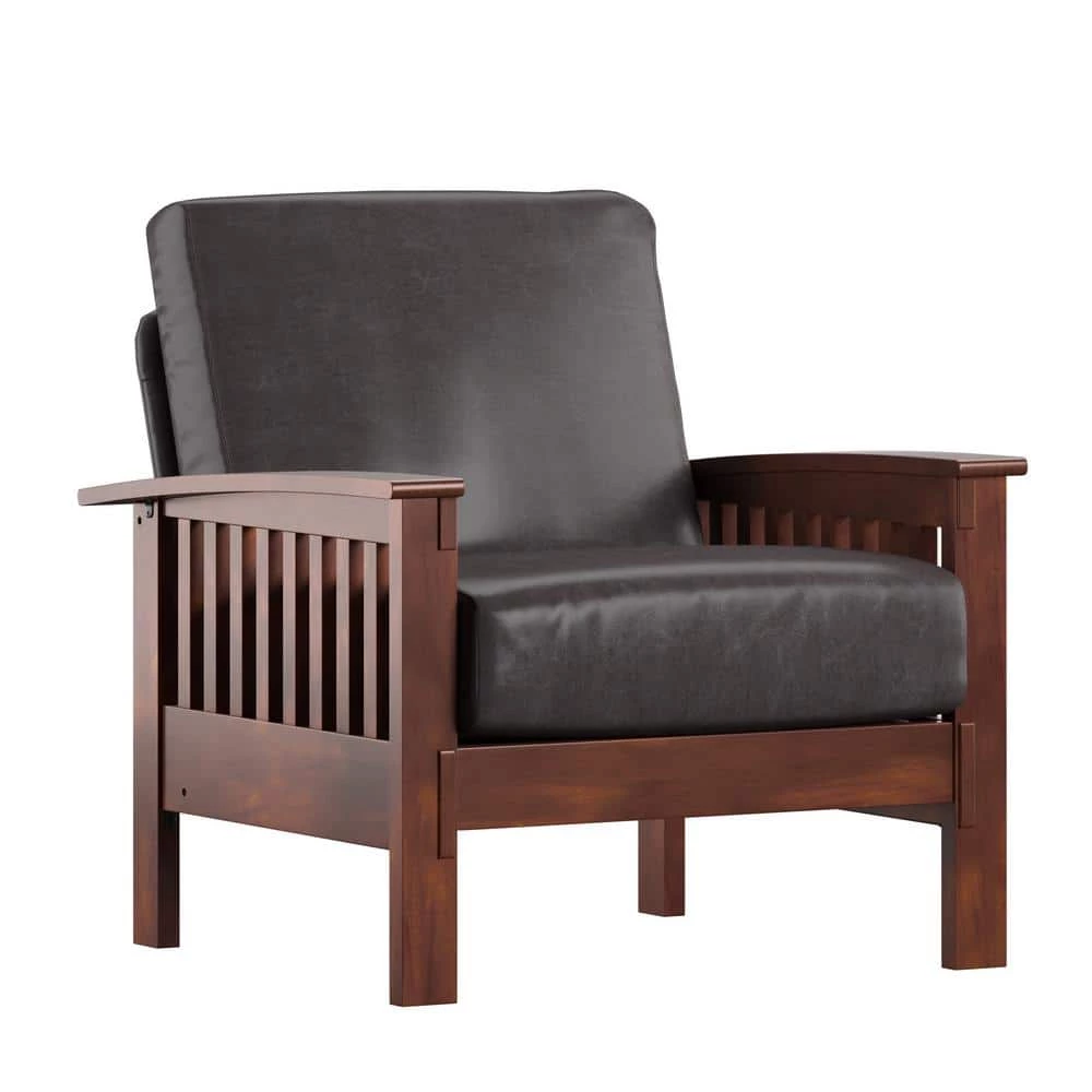 Obtain that “At home” feeling with the Mission-Inspired Vinyl Arm Chair. The upholstered seat is foam filled for ultimate comfort and added cushion so you can kick your feet up after a long day. The wood frame features a slat design located on each side of the chair, giving the piece classic styled detail, while the rubberwood construction ensures lasting durability for years to come.