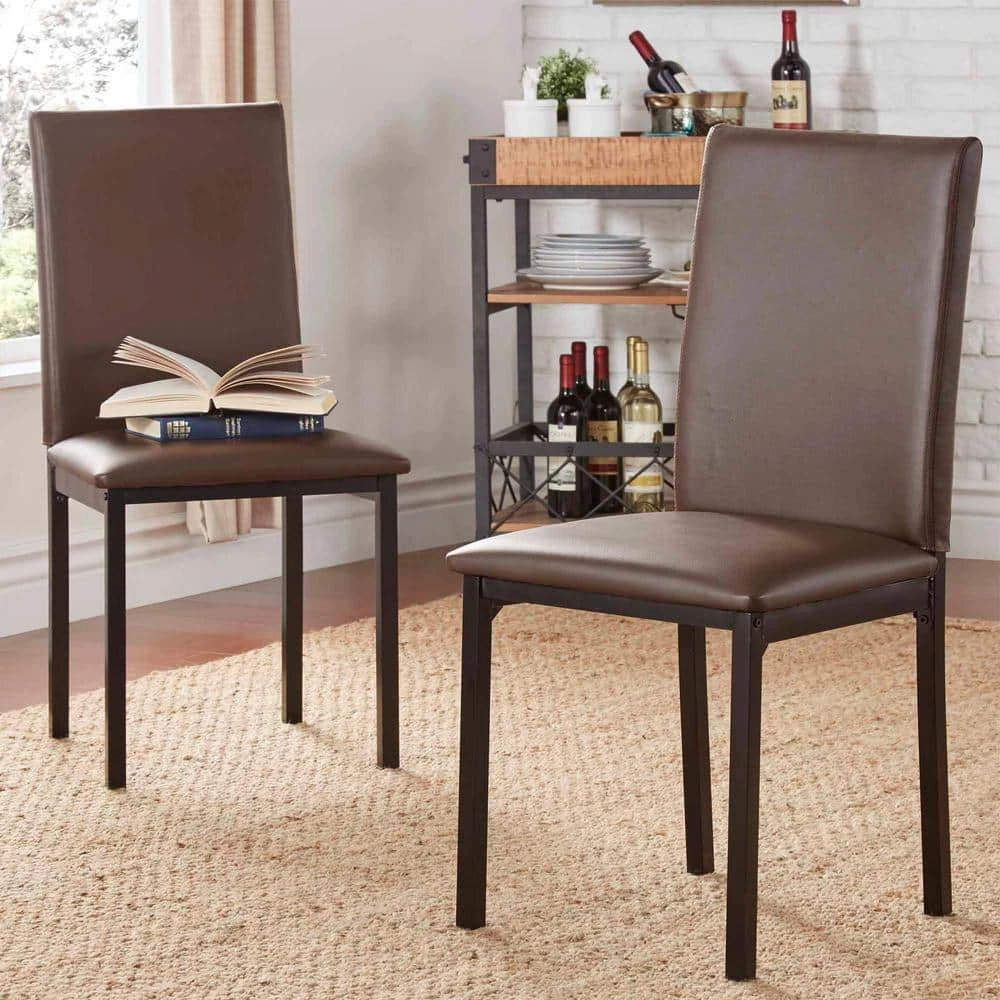 Complete the look of your dining area with these chairs. With its clean, streamlined design these chairs are to complement most room settings. Sold as a set of two these chairs are built with a strong metal frame and have faux leather upholstery ensuring comfort and stability that will last.