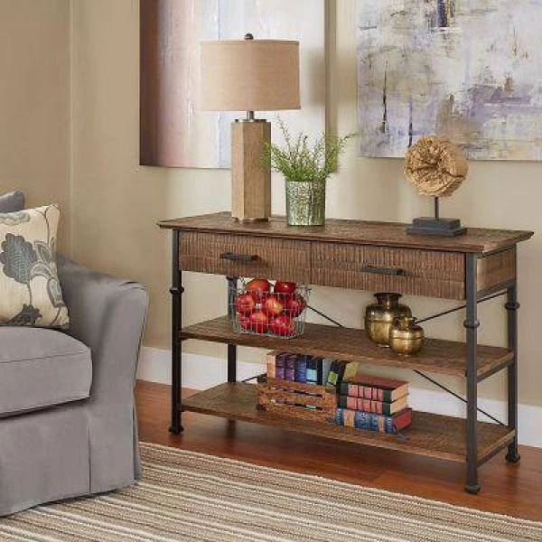 Bring modern flare to your living space with the Grove Place Rustic Elegant Detailed Leg Storage Tv Stand. The two rustic wood shelves provide a place to display your favorite home accessories or even your DVD collection. The powder coated metal frame combined with the suspension cable detail lends an industrial theme to this basic piece.