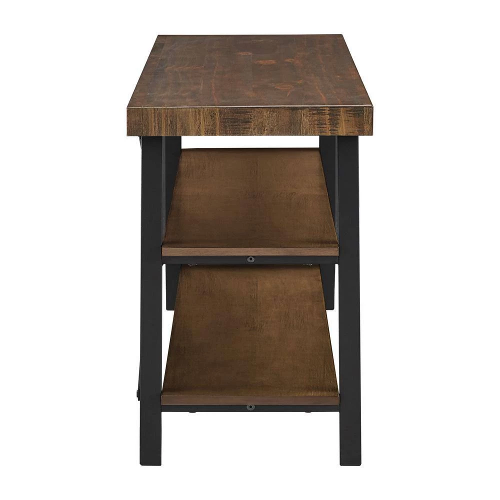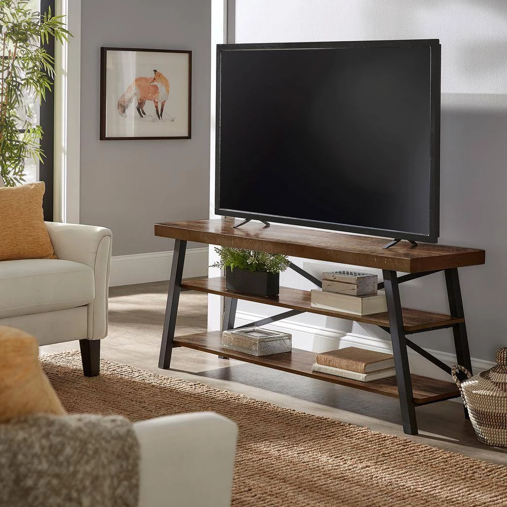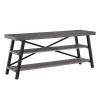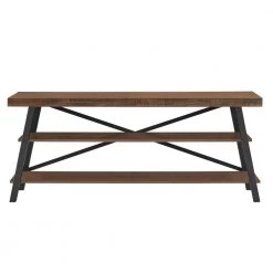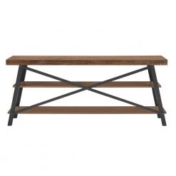 Give your family room an urban, industrial vibe with the Rustic X-Base 60-inch TV Stand from HomeSullivan. This sophisticated table features an open design with enough space to setup a large TV while the two lower shelves provide plenty of room for your media. The shelves bear a visible wood grain finish that contrasts beautifully against the black, powder-coated metal base.