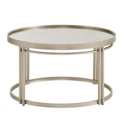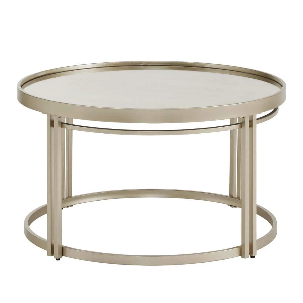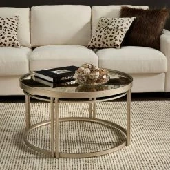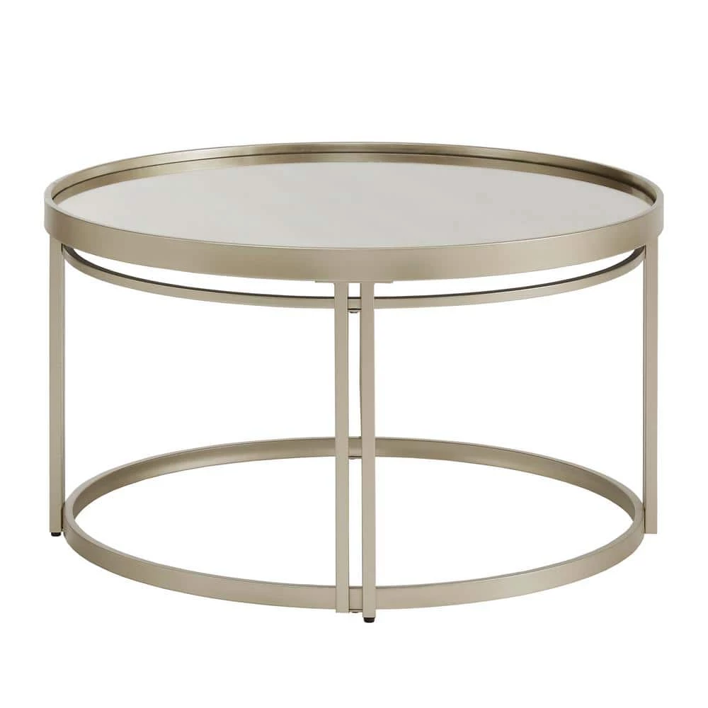 The Champagne Silver Finish Antique Mirror Top Coffee Table delivers a look of modern elegance to your home. This contemporary table showcases a shimmering, champagne silver base that, framing antique mirror table top. The table is built from sturdy metal tube to promise years of use.
