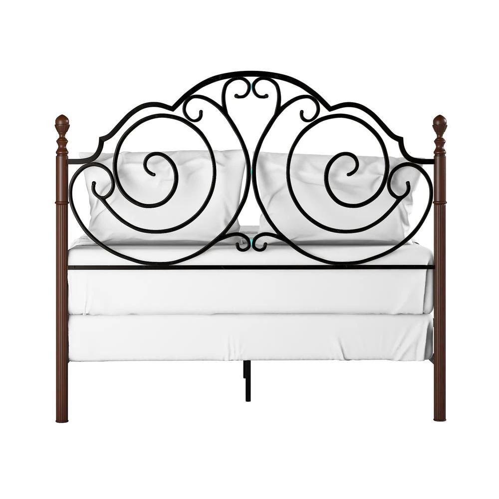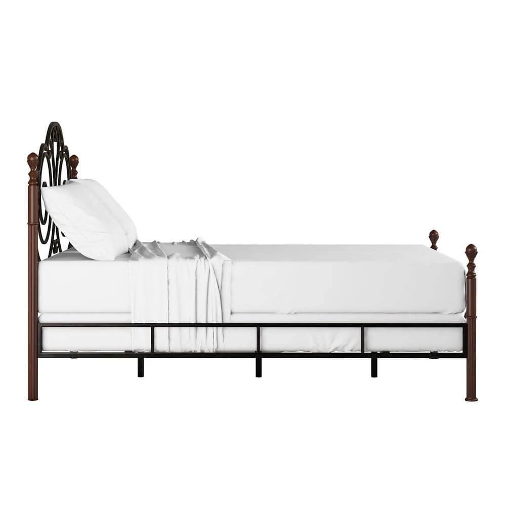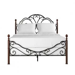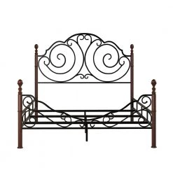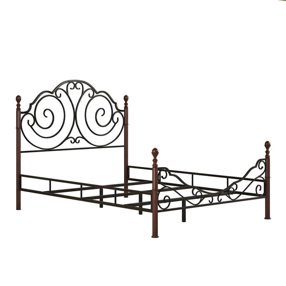 Give your bedroom the perfect touch of effortless elegance with Graceful Scrolls Poster Metal Bed. Contrasted by the bronze design work are sleek cherry finished bed posts for eye-catching appeal. The cast iron gracefully drapes an arch around the headboard and scoops at the footboard. This bed is perfect for a room inspired by vintage charm and is ready to complement your style. The bed is made of a sturdy metal that is polished in distressed bronze that will last for many years.