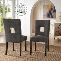 The HomeSullivan side chairs are the perfect addition to the contemporary home. The chairs feature neutral upholstery with black finish legs for an easy match to any decor. The chair backs further the contemporary feel with a keyhole cutout in the curved back.