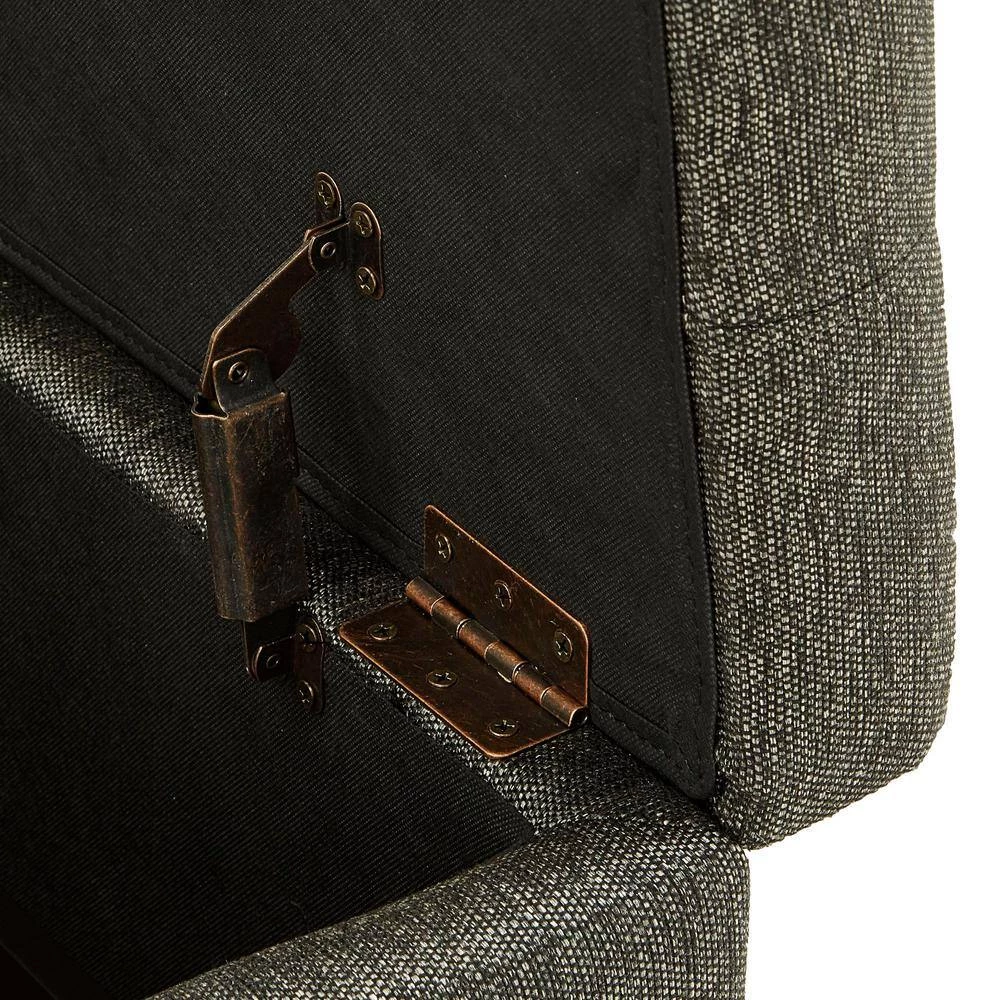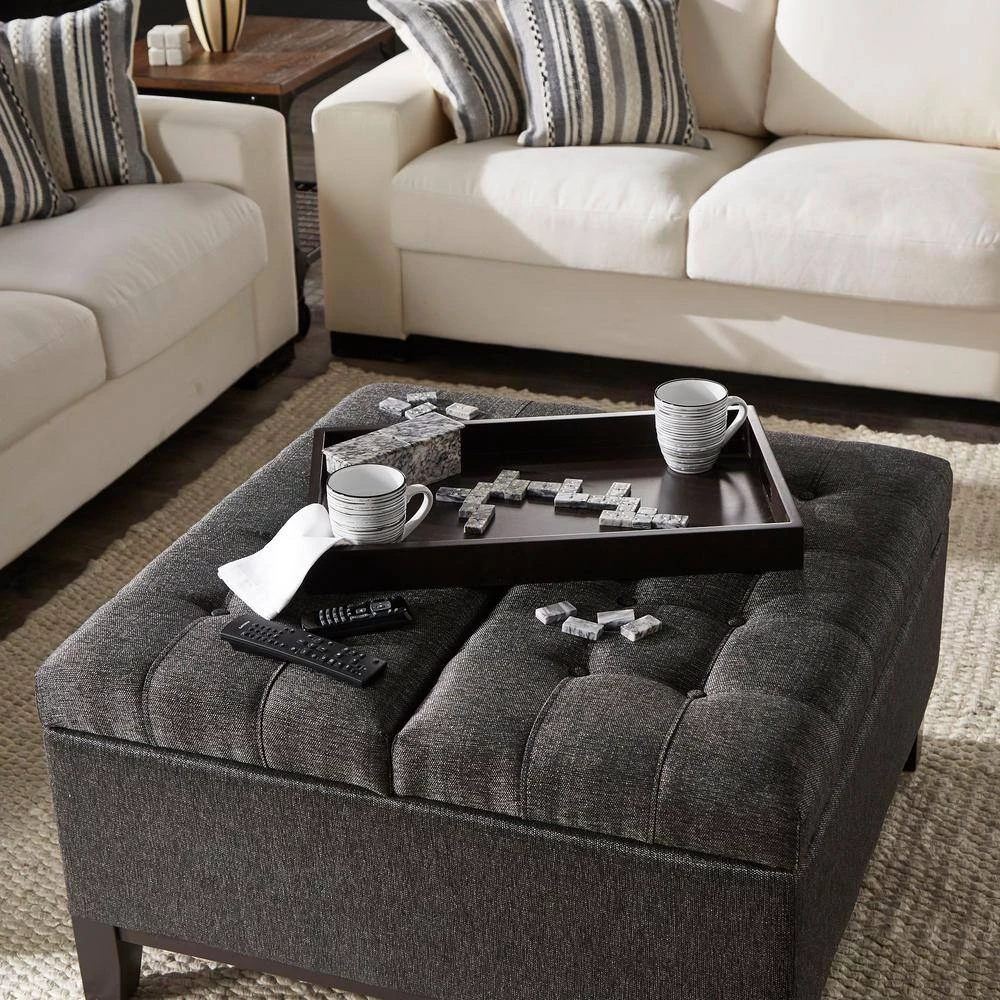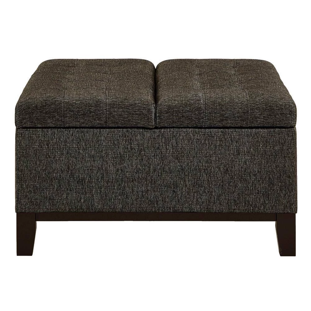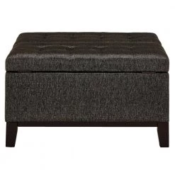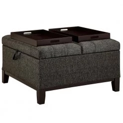 Perfect for a family room or den, the Dark Grey Lift Top Storage Ottoman provides you versatility and comfort. With soft, dark grey upholstery and tufted cushions, this clever storage ottoman serves as a comfortable spot to rest your feet and doubles as a cocktail table . Two included black wooden trays can sit on top of this piece for keeping drinks and snacks in a secure, convenient spot. A split top design features one side that lifts to reveal an interior storage compartment, perfect for blankets or pillows. The other side can be placed in a slightly elevated position for a raised footrest surface, revealing more storage beneath.