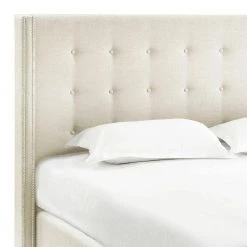 The Franklin Park bed is blends old and new traditions for an elegant centerpiece for your bedroom. The headboard features a distinguished wingback detail accented with nailhead detail and button tufting. The entire bed is upholstered in an elegant white linen.