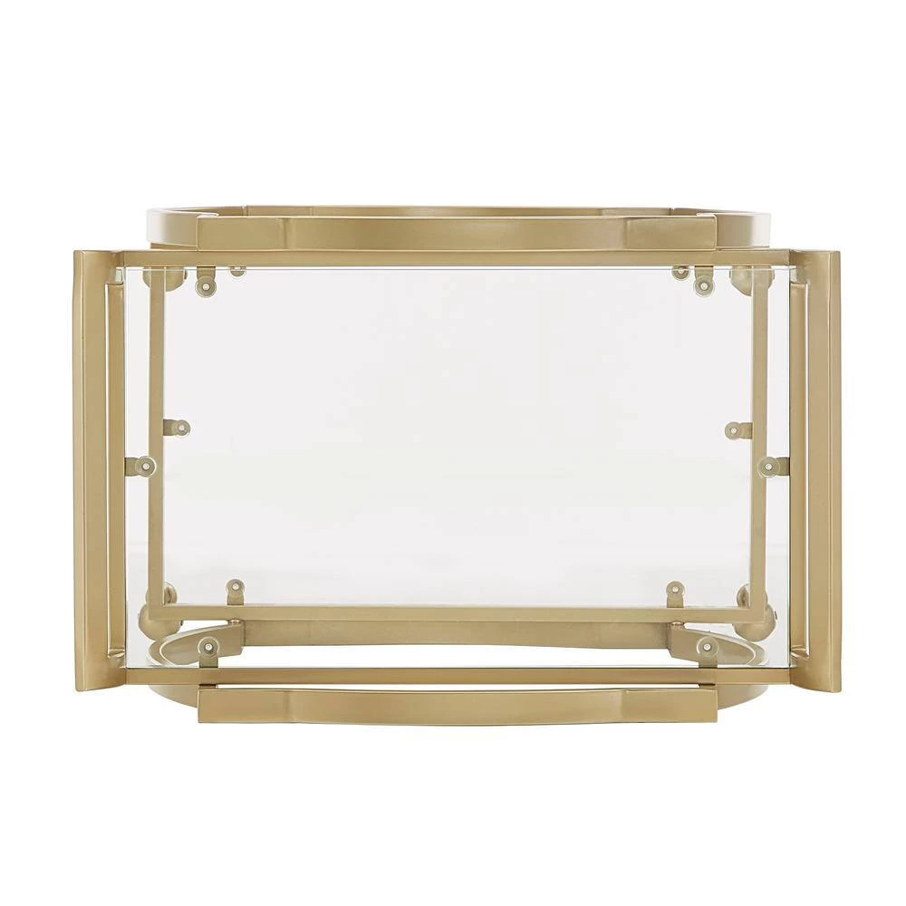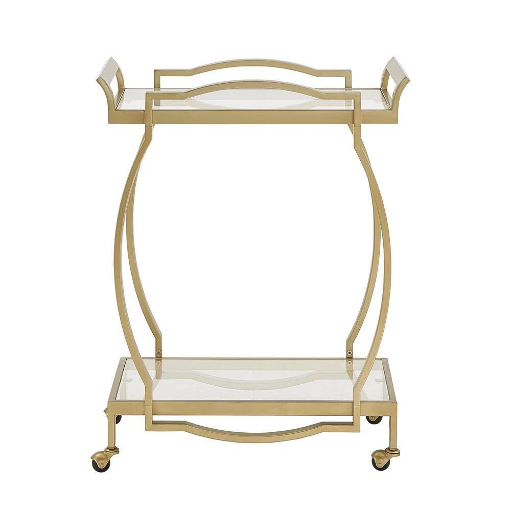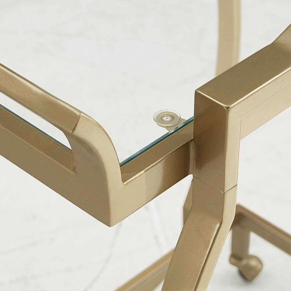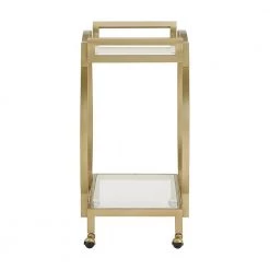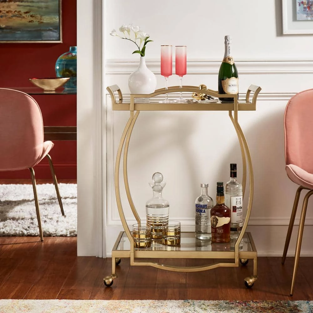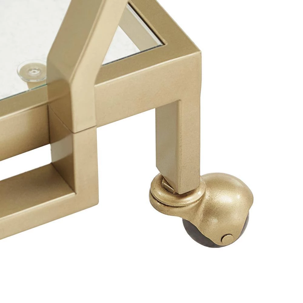 Get this beautiful cart and set the stage for a glitzy look within your living space. With it’s mirrored top and bottom shelves, this Gold Finish Clear Tempered Glass Metal Bar Cart is the perfect place to keep all of your party and cocktail essentials. A glistening, gold finish metal frame ties the cart’s design together to add a timeless, glam look to your home’s decor. 360-spin caster wheels allow the cart to be easily maneuvered from room to room- allowing you to give your guests the ability to get the party started in any area you choose.