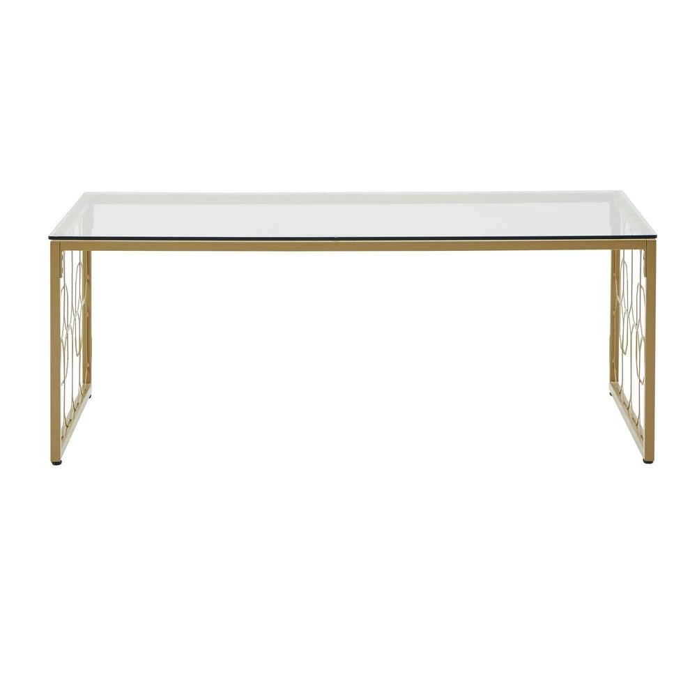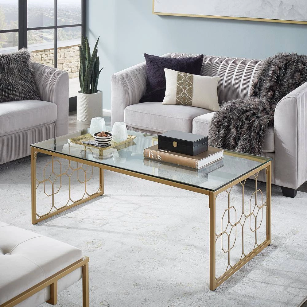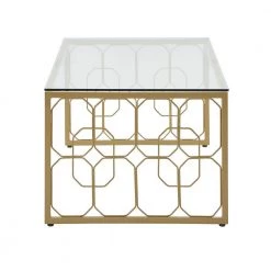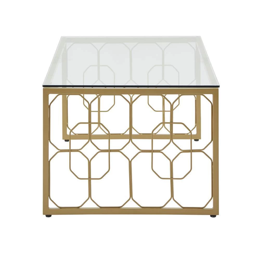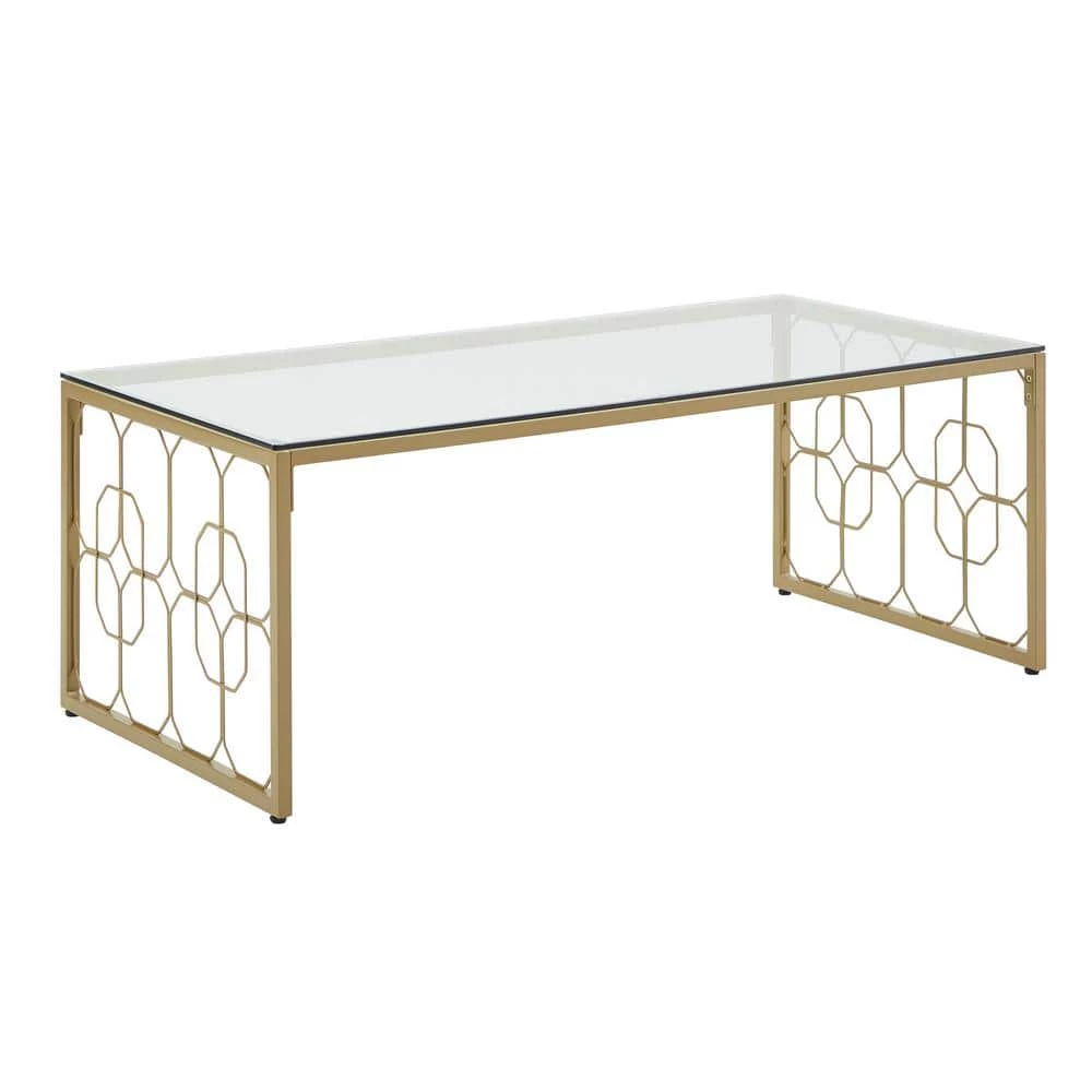 Deliver a look of sophisticated elegance with the Octagon Pattern Gold Metal and Glass Coffee Table. Founded on gold, powder-coated metal base, this table features ornamental, octagonal designs along the sides. The generous table top is made with clear, tempered glass, enhancing the eye-catching aesthetic. This unique piece is perfect for glam or eclectic themes.