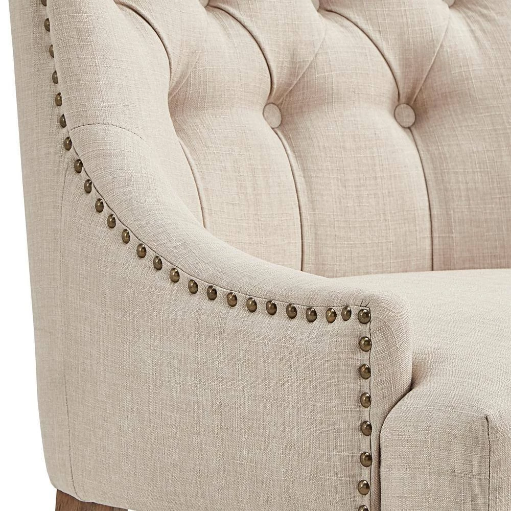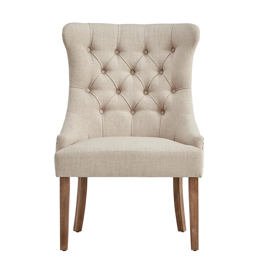 Provide regal comfort at your dinner table with this Upholstered Button Tufted Wingback Chair from HomeSullivan. Coming in a variety of upholstery options, this accent chair radiates elegance with its plush button-tufted backrest, delicate nailhead trim, and wingback design. The foam-padded and linen-upholstered seats will have your guests dining in luxury. Boasting a sturdy wooden construction, the chair legs bear a lightly distressed finish for a timeless, rustic touch. This chair fits with a plethora of design styles in your formal dining room, from transitional to modern farmhouse.