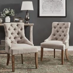 Whether your style aesthetic is farmhouse, rustic, shabby chic, or formal, the Marjorie Chair from HomeSullivan is the absolute perfect addition to spruce up the look of your space. Elevated details like a sloped back and button tufting showcase a high end look for these chairs. Accented by wood legs, these are a must-have for any space.