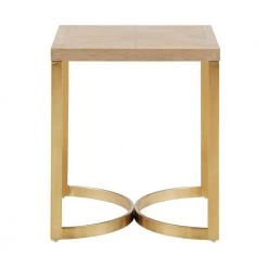 Craft a look of refinement and elegance in your home with the Natural Finish and Gold End Table. The design of the table perfectly balances the bold with the natural to showcase unique, eye-catching appearance. A smooth, sizable table top is constructed with oak and veneer for strength and resiliency and displays an artful wood grain finish. Radiant stainless-steel bases add a touch of glamour with their curved shapes and glittery gold finish.