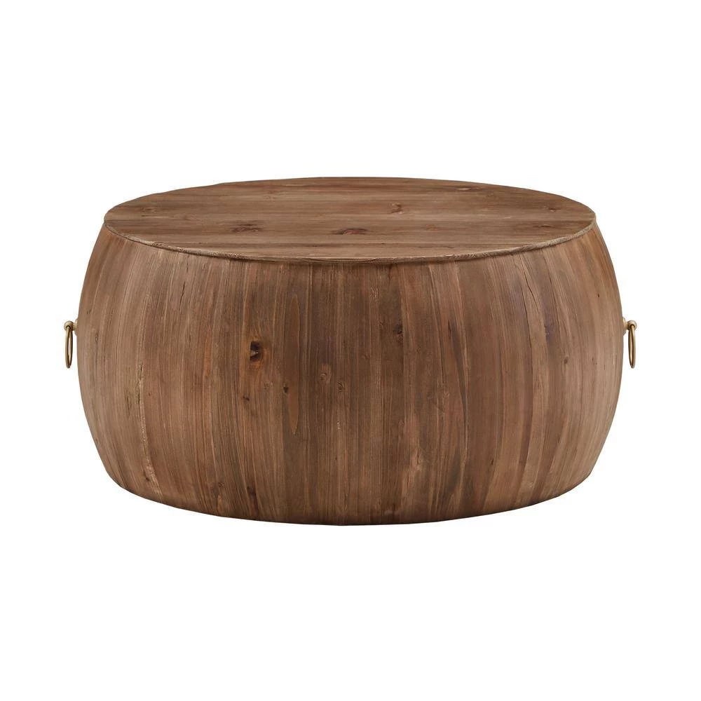 Strength and sophistication come together with the Reclaimed Wood and Gold Ring Wine Barrel Coffee Table. Features generous table top, wine barrel shape and visible wood grain finish to create a charming, countryside aesthetic. Gold metal ring add industrial styled detail and an exciting pop of color to the piece. Constructed with resilient reclaimed pine, solid wood and iron for lasting durability, this artisan table comes in multiple finishes to fit right in with any setting.