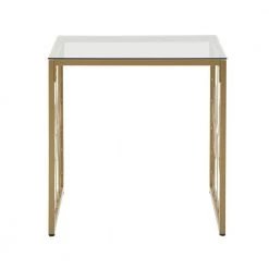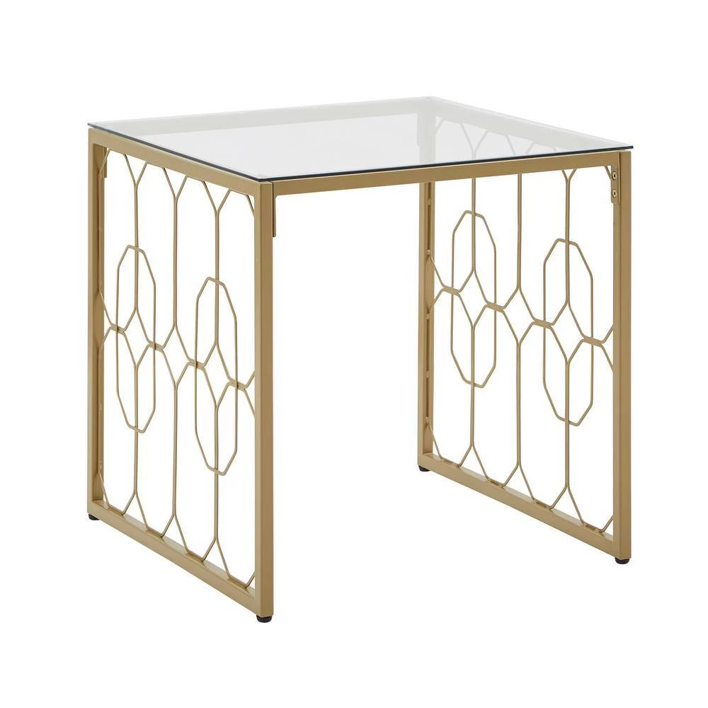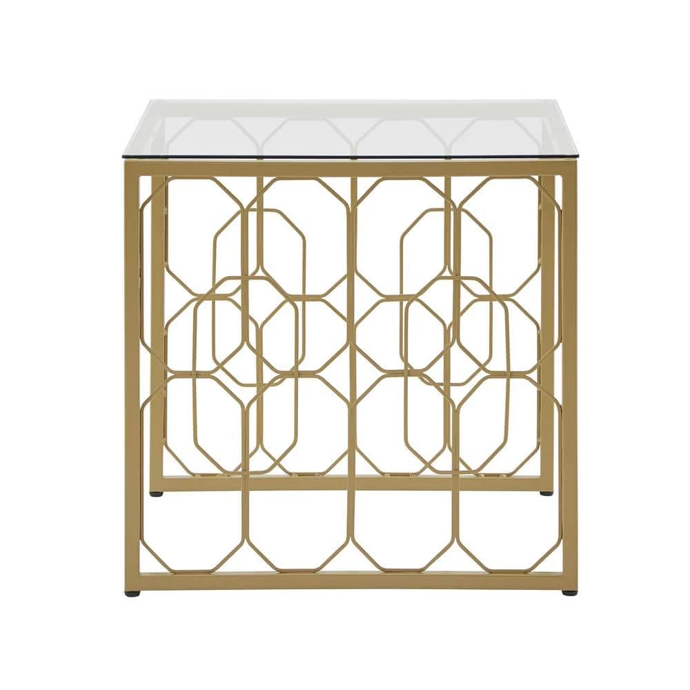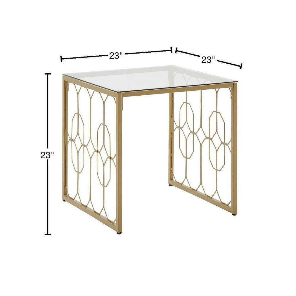 Deliver a look of sophisticated elegance with the Octagon Pattern Gold Metal and Glass End Table by HomeSullivan. Founded on a gold, powder-coated metal base, this stunning piece features ornamental, octagonal designs along the sides. The generous table top is made with clear, tempered glass, enhancing the eye-catching aesthetic. This unique piece is perfect for any glam or eclectic themes.