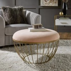 Make your living space stand out with the stylish and sophisticated Fabric Upholstered Round Ottoman by HomeSullivan. The fabric upholstered top will add more than enough comfort and cushion for you to rest your feet, while a gold powder-coated metal base provides stability and a modern look to your space. The open-styled base adds an elegant and unique touch to your home that is sure to serve as the focal point of any room.