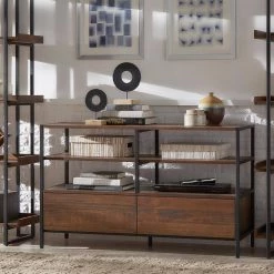 Add a pop of modern rustic design your space with the Rustic Brown TV Stand Console Table. It features a rich brown textured wood grain finish framed by black powder coated metal. The metal framing adds stability, as well as contrast, to create an eye-catching design. The accent table is not only stunning industrial-rustic pieces, but its shelves and drawers create plenty of space for you to place your TV, books, decor, or other small items.