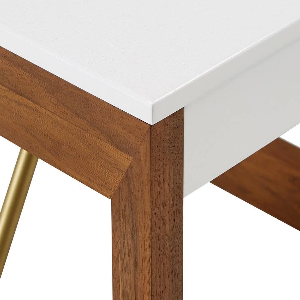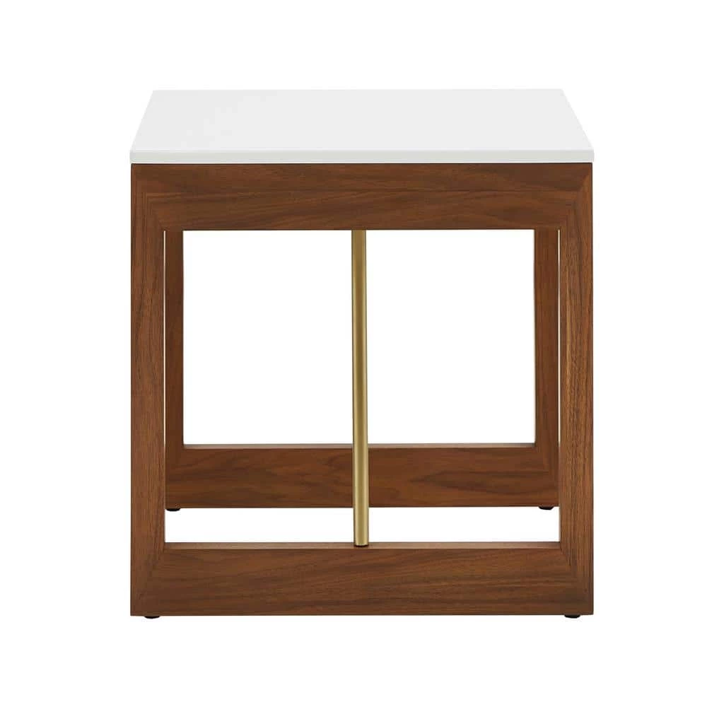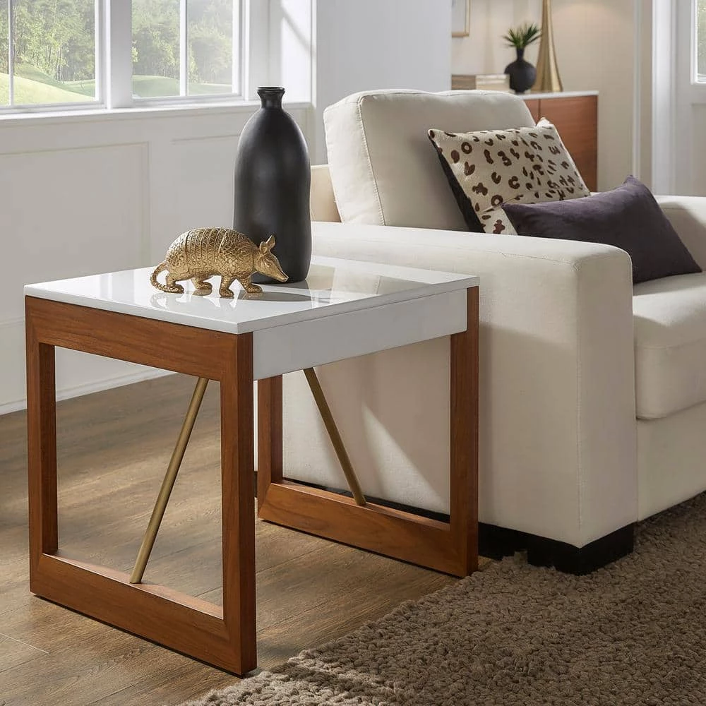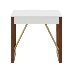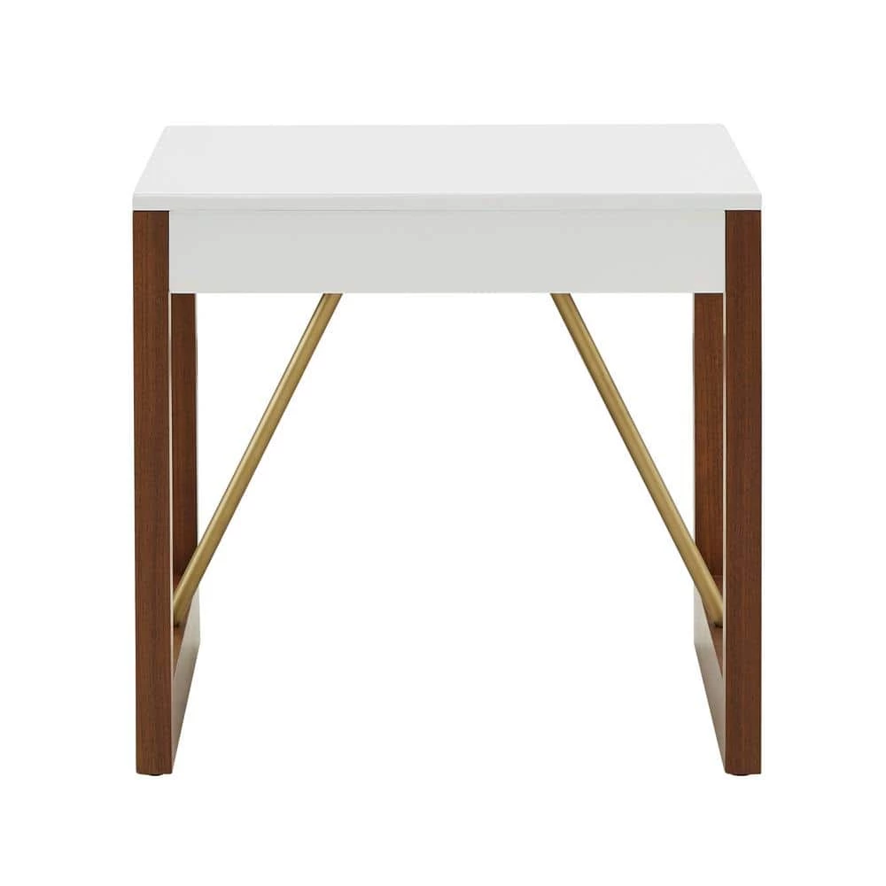 The Two-Tone High Gloss White and Walnut Finish End Table from HomeSullivan updates your living space in stylish fashion. White, gold, and brown hues complement each other beautifully in this piece for an eye-catching look. The smooth table top is finished in a high gloss white finish that has some sparkle to it. A walnut finish accents the sides of this table, bearing a visible wood grain for a more down-to-earth aesthetic. Gold-finished metal bars complete this piece, adding clean-cut lines and a pop of glamour. Add this versatile piece to any contemporary or bold-themed space.