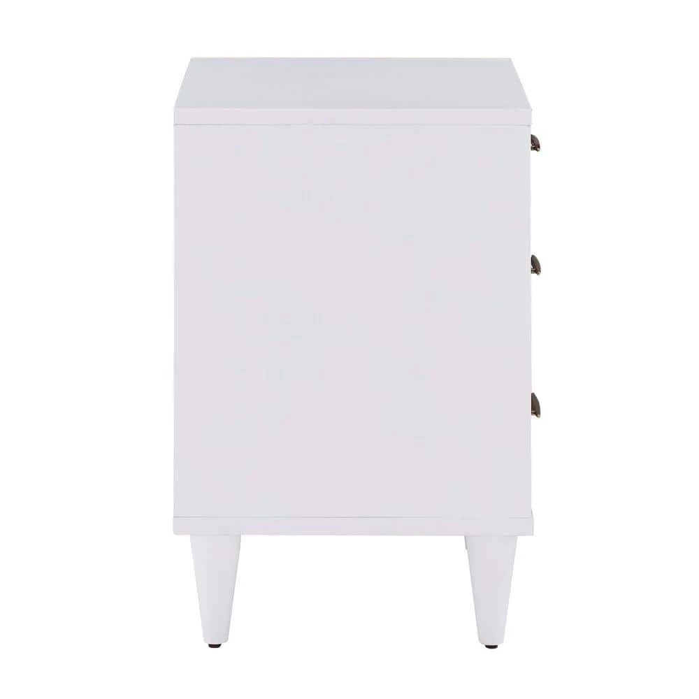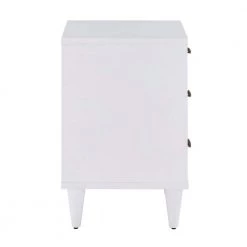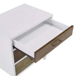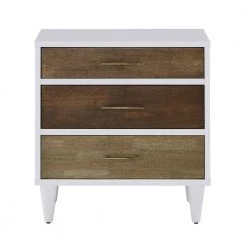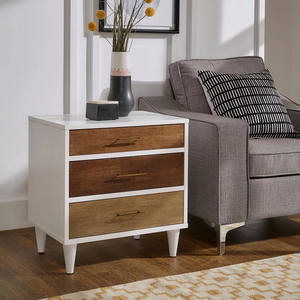 Store your belongings in style with the White and Natural Finish 3-Drawer Nightstand. Constructed with rubber wood and veneer for durability and strength, this chic nightstand works great in modern or transitionally designed settings. Gold metal hardware accents the three sizable drawers as they each bear varying shades of natural wood. A white finish showcased on the frame and tapered legs ties the whole look together for a unique, contemporary effect.