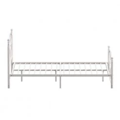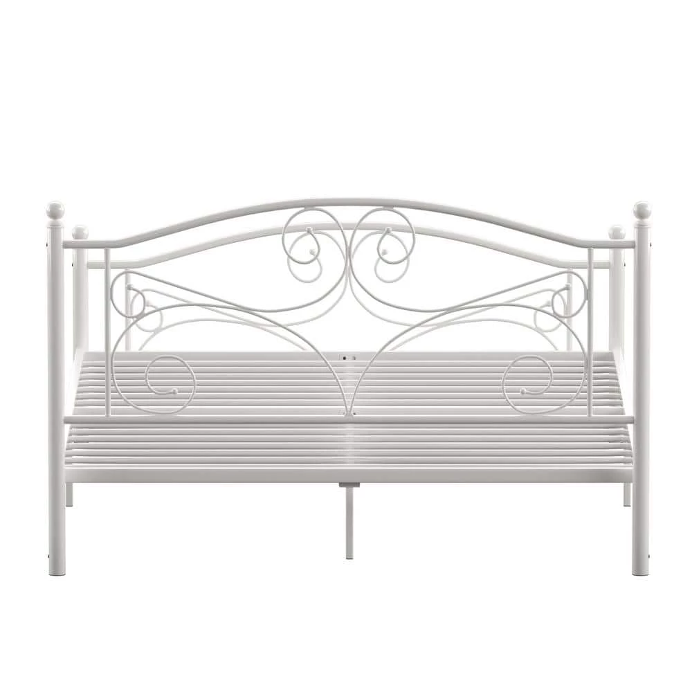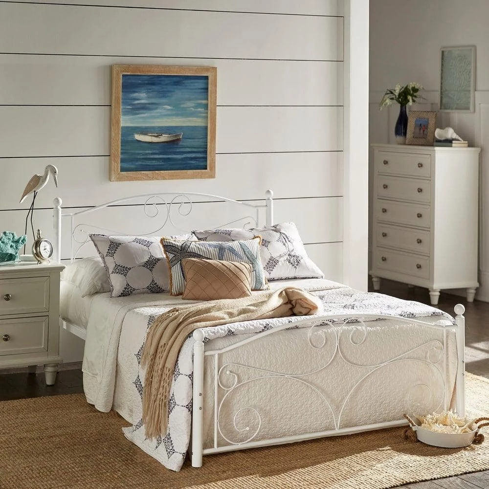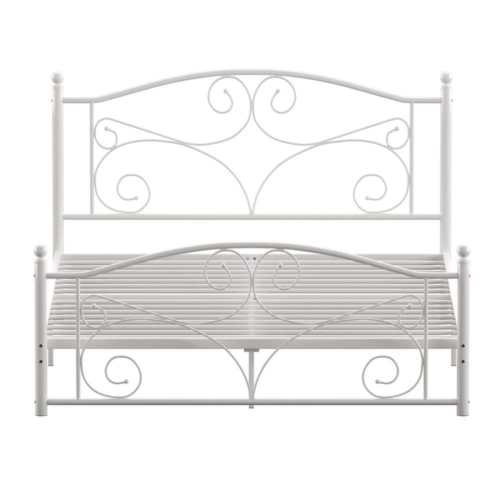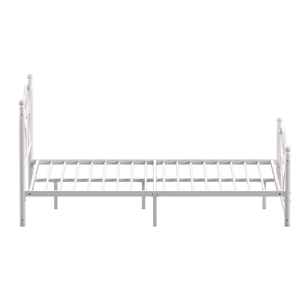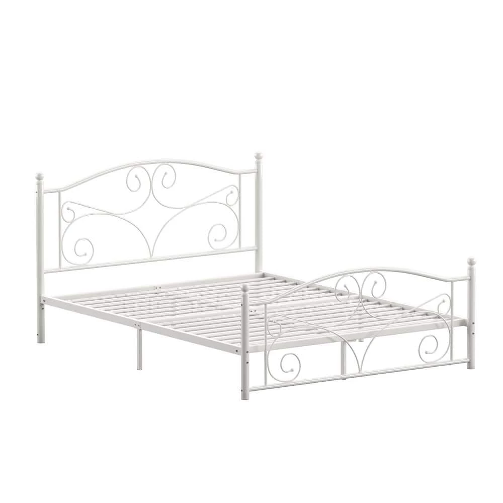 Establish a vintage aesthetic in any bedroom of your home with this White Metal Queen Platform Bed. Elegance radiates from the head and footboards with the gentle curves and sphere finials decorating them. Whether placed in the guest room, master suite, or kid’s room, this beautiful bed is constructed from metal to provide long-lasting support and durability for a good night’s rest. This charming bed comes in a snowy white finish, making for easy matching with a variety of color schemes and design styles.