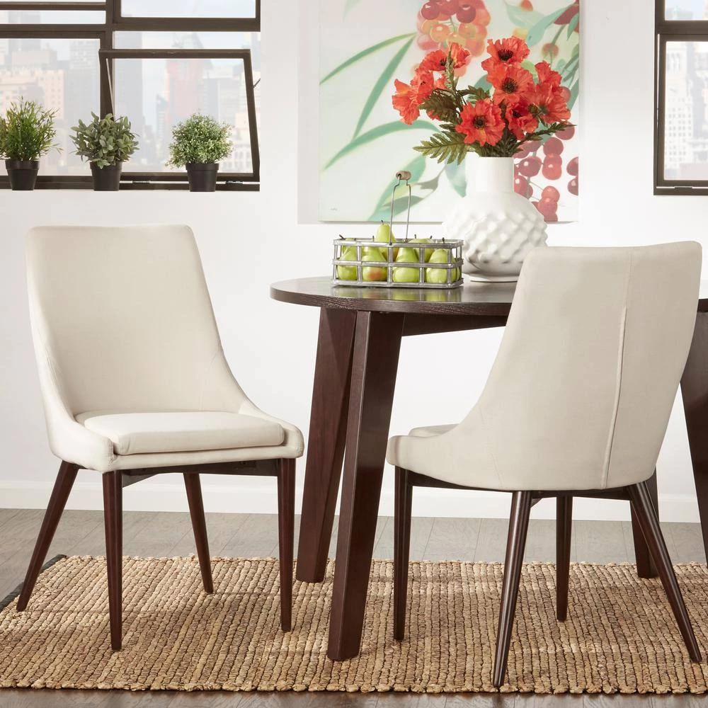 Add a touch of contemporary to your seating arrangement with these chairs. These are built with angled legs and have a soft linen upholstery providing comfort and support. Sold as a set of two (2), the clean lines in these chairs will coordinate well with many decor styles blends Mid Century aesthetics with contemporary elements for beautiful pieces that will complement your modern lifestyle. Clean lines and straightforward materials like wood finishes and sleek, metal accents bring to life the dynamic, vintage ambiance of this collection.