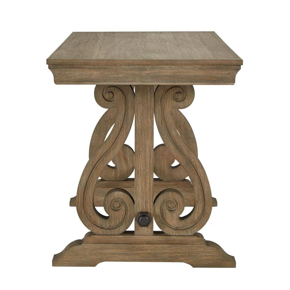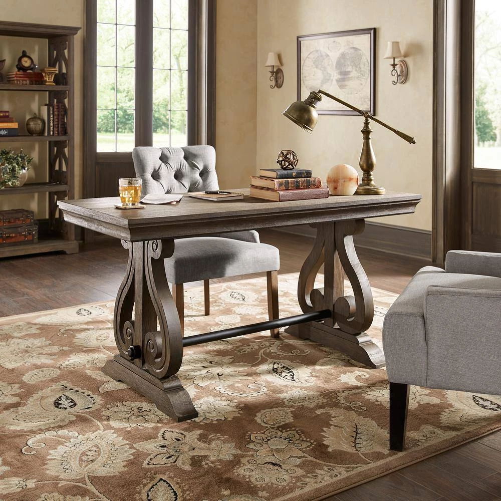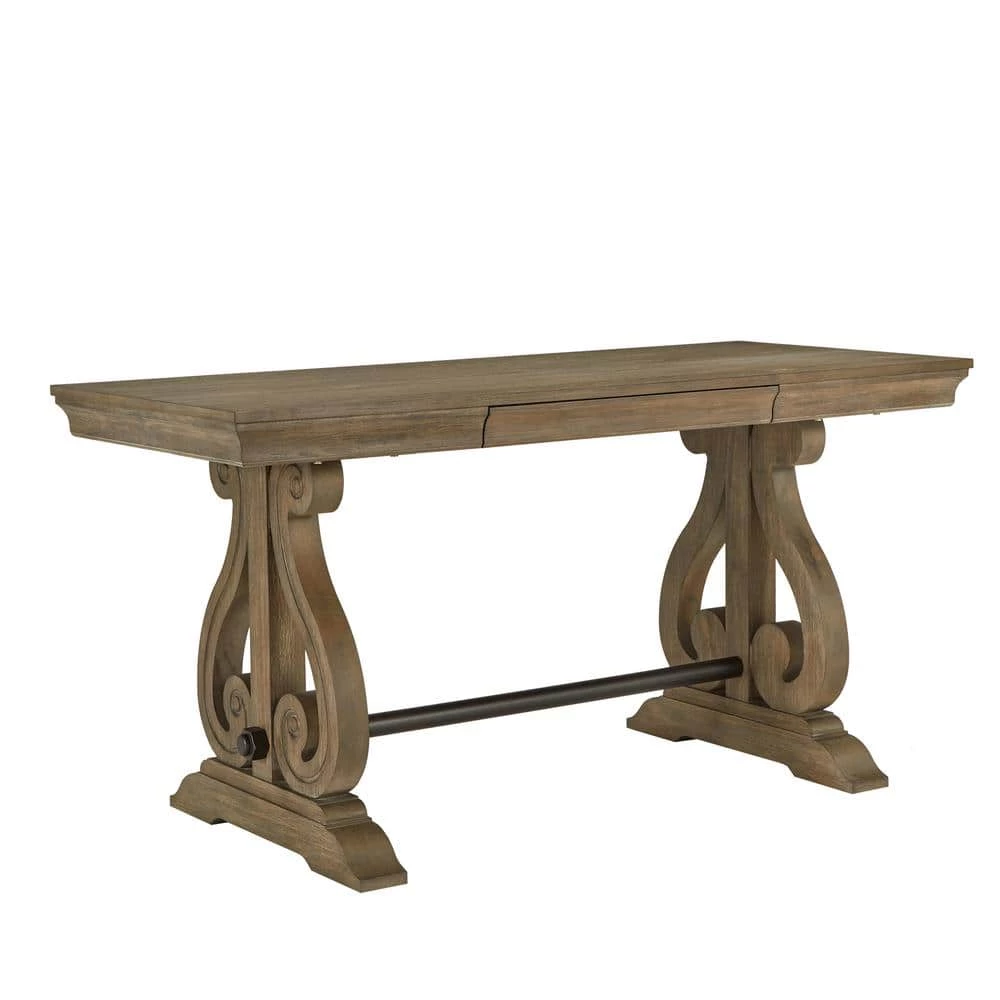 Lend an Old-World vibe in your workspace with this Wire Brushed Oak Finish 1-Drawer Writing Desk. Serving as the perfect centerpiece to any home office or study, this beautiful desk is expertly crafted from solid wood and pine for long-lasting durability. This desk radiates elegance and sophistication with its intricate wood details, charming wooden curves, and rich wire brushed oak finish. A desk is equipped with this desk to store writing utensils or important documents as you spread your work out on the sizable table top. This timeless piece blends right in with any traditional, farmhouse, or shabby chic theme in your home.